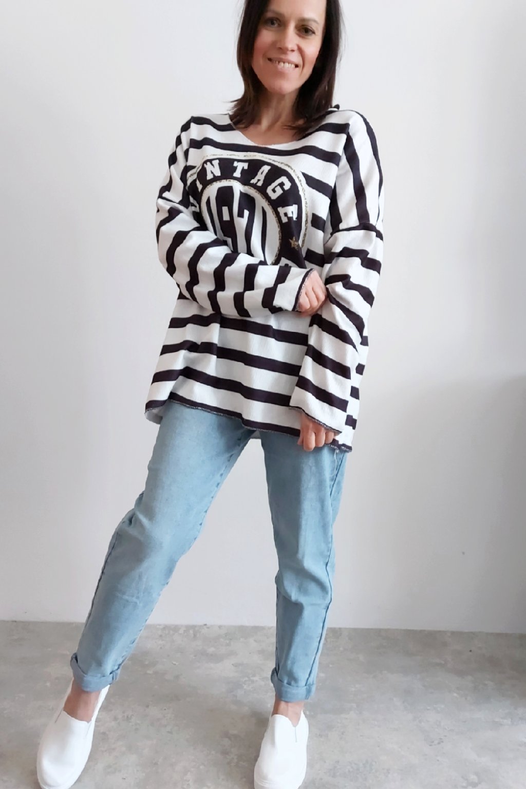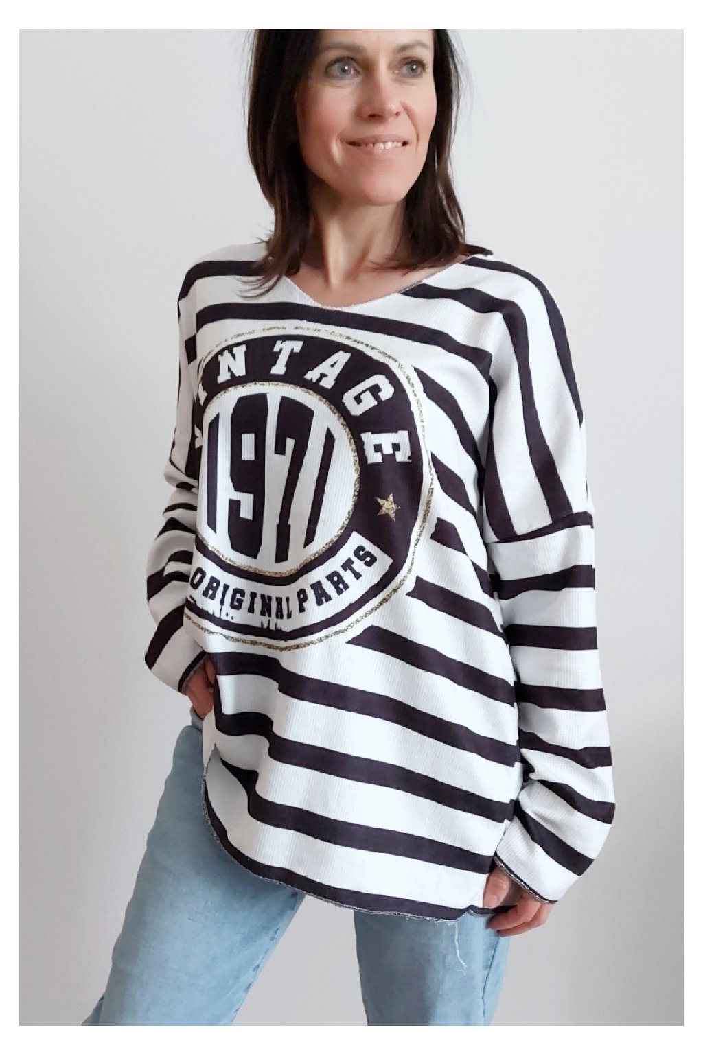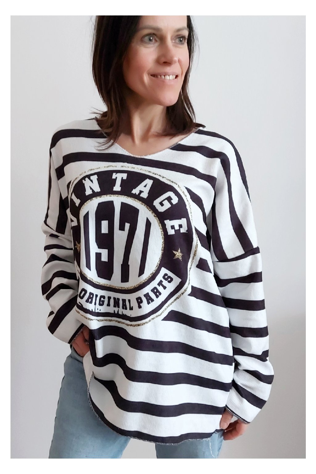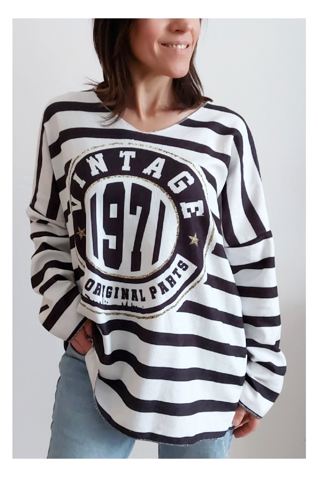 Skvělé triko ze silnějšího máslového materiálu. Véčkový výstřih. Motiv pruhů a nažehlený motiv s nápisem. Rukávy dlouhé. Rovný, volný střih. Nezapošité kraje, jen ustřižené. Materiál měkkoučký, máslový - hebký, na těle velmi příjemný. Foceno na vel. XS, výška 156cm.