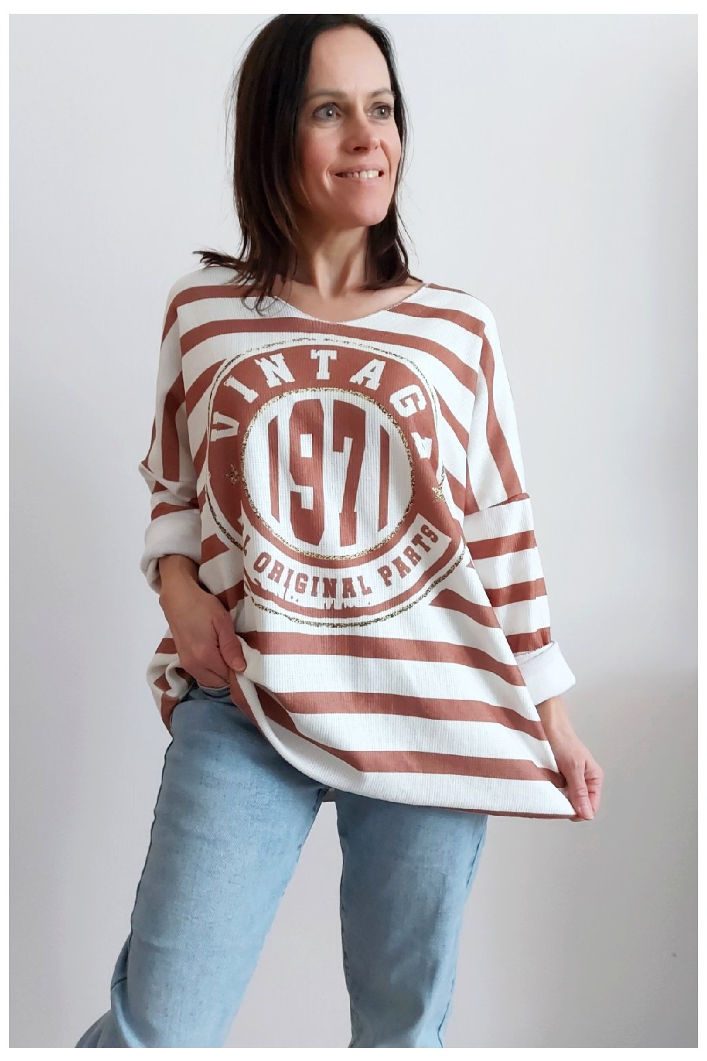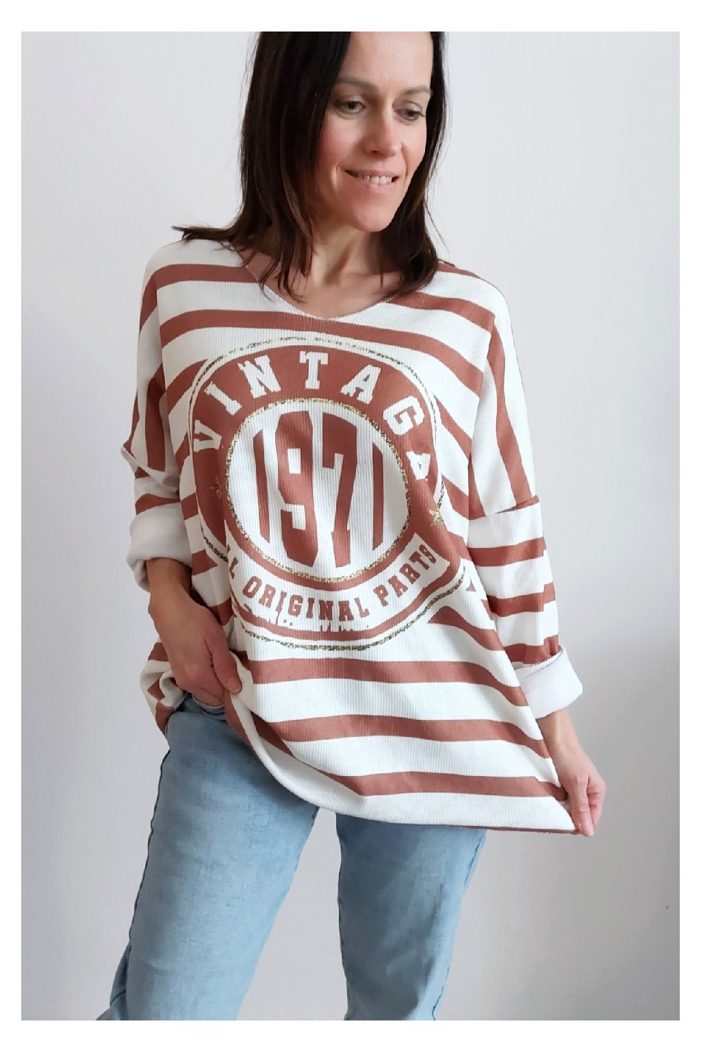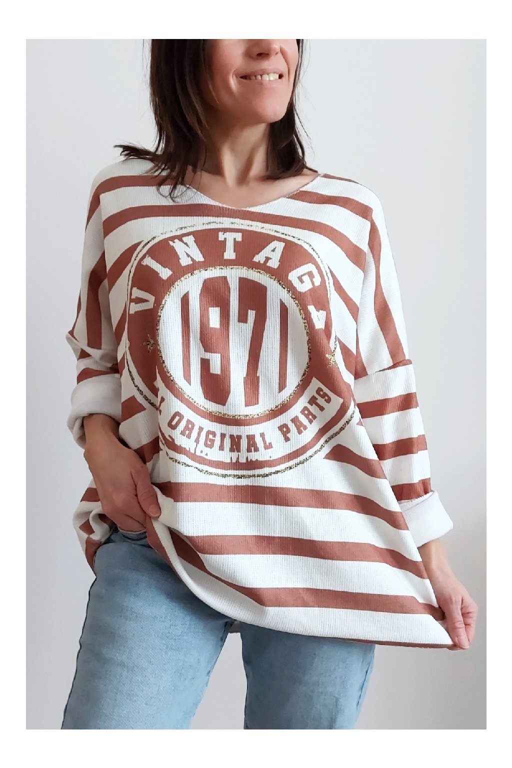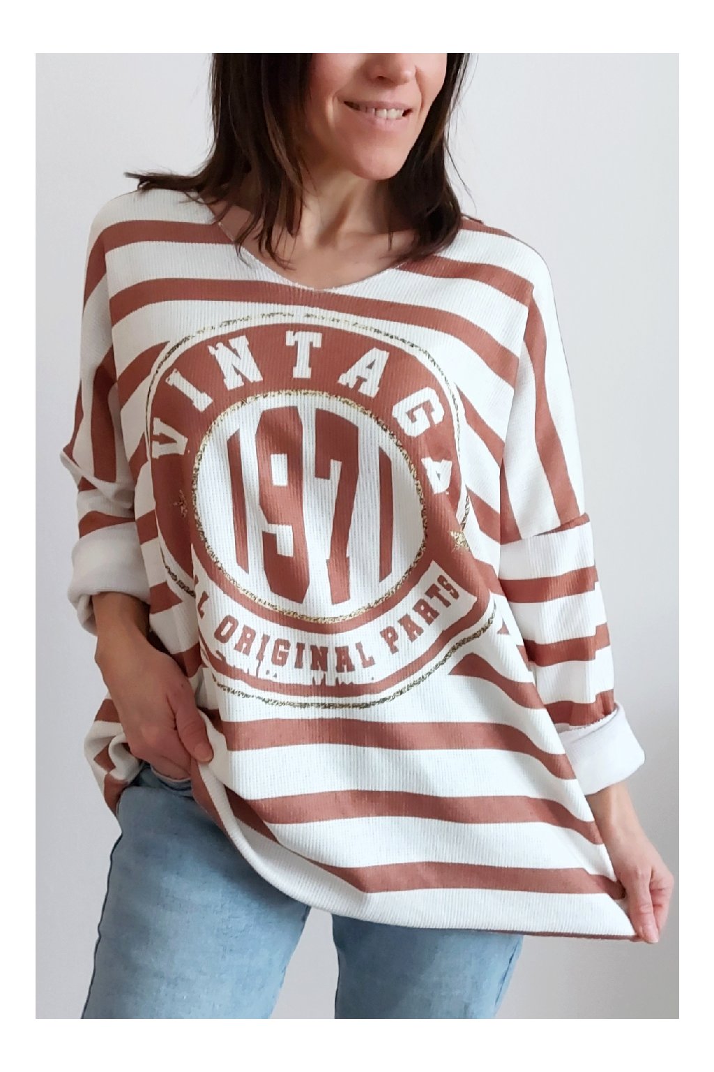 Skvělé triko ze silnějšího máslového materiálu. Véčkový výstřih. Motiv pruhů a nažehlený motiv s nápisem. Rukávy dlouhé. Rovný, volný střih. Nezapošité kraje, jen ustřižené. Materiál měkkoučký, máslový - hebký, na těle velmi příjemný. Foceno na vel. XS, výška 156cm.