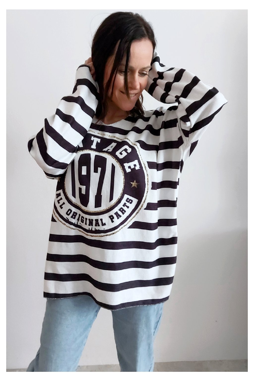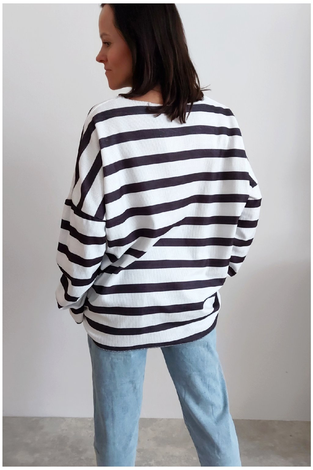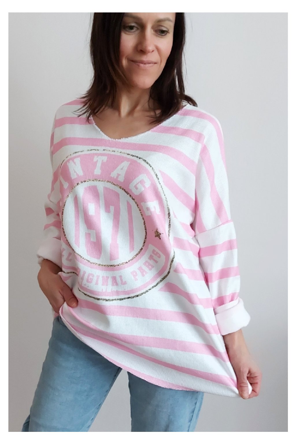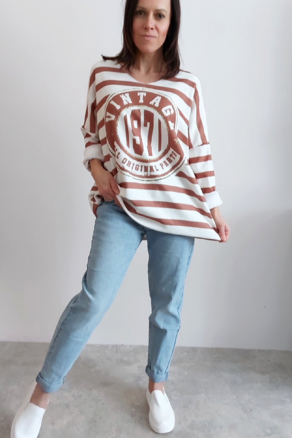 Skvělé triko ze silnějšího máslového materiálu. Véčkový výstřih. Motiv pruhů a nažehlený motiv s nápisem. Rukávy dlouhé. Rovný, volný střih. Nezapošité kraje, jen ustřižené. Materiál měkkoučký, máslový - hebký, na těle velmi příjemný. Foceno na vel. XS, výška 156cm.