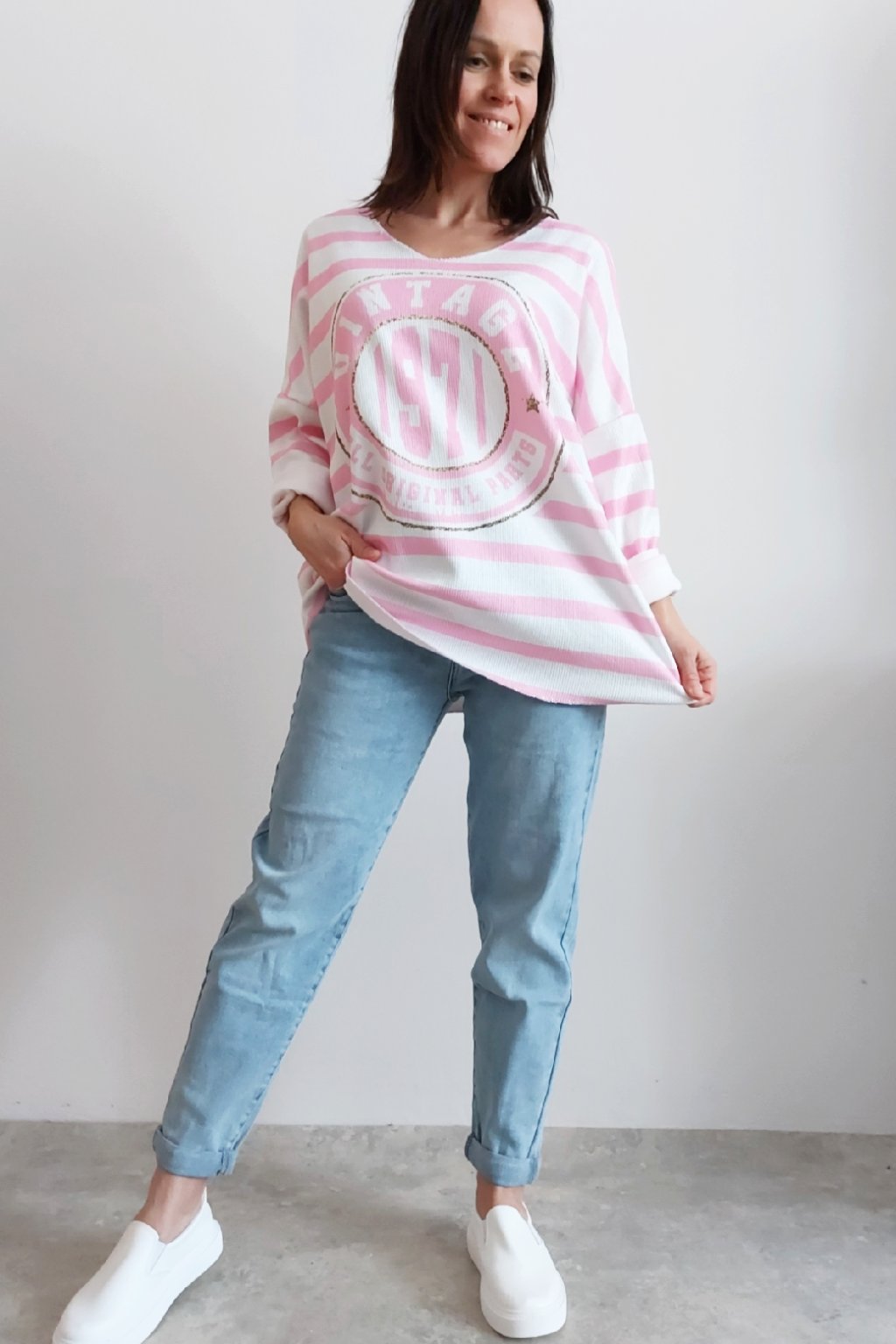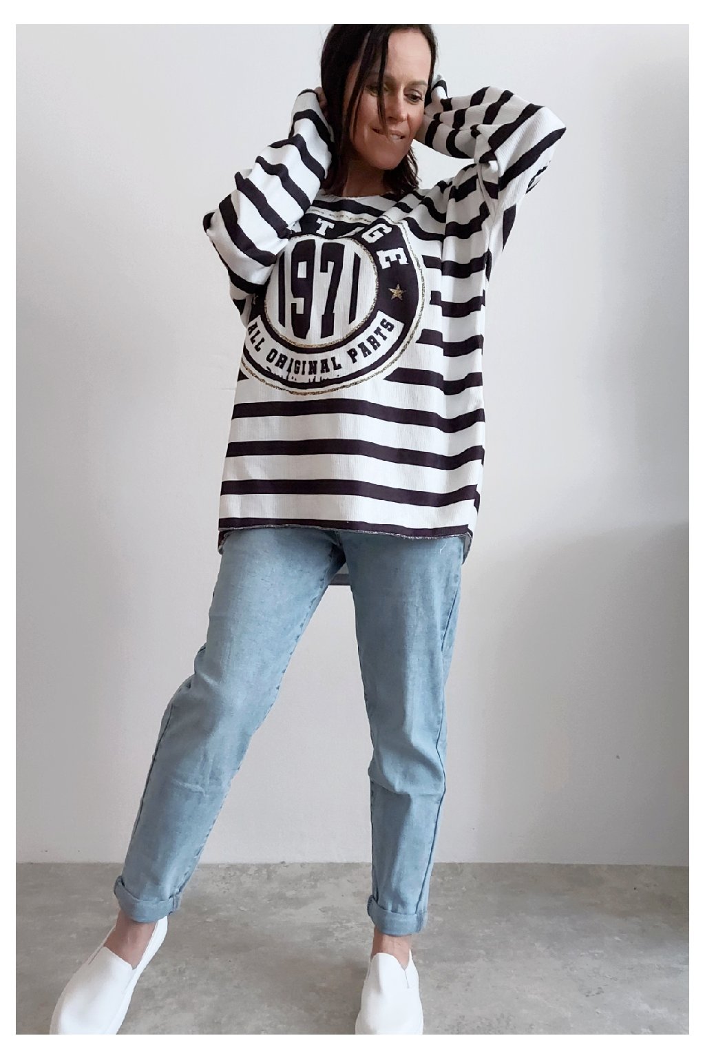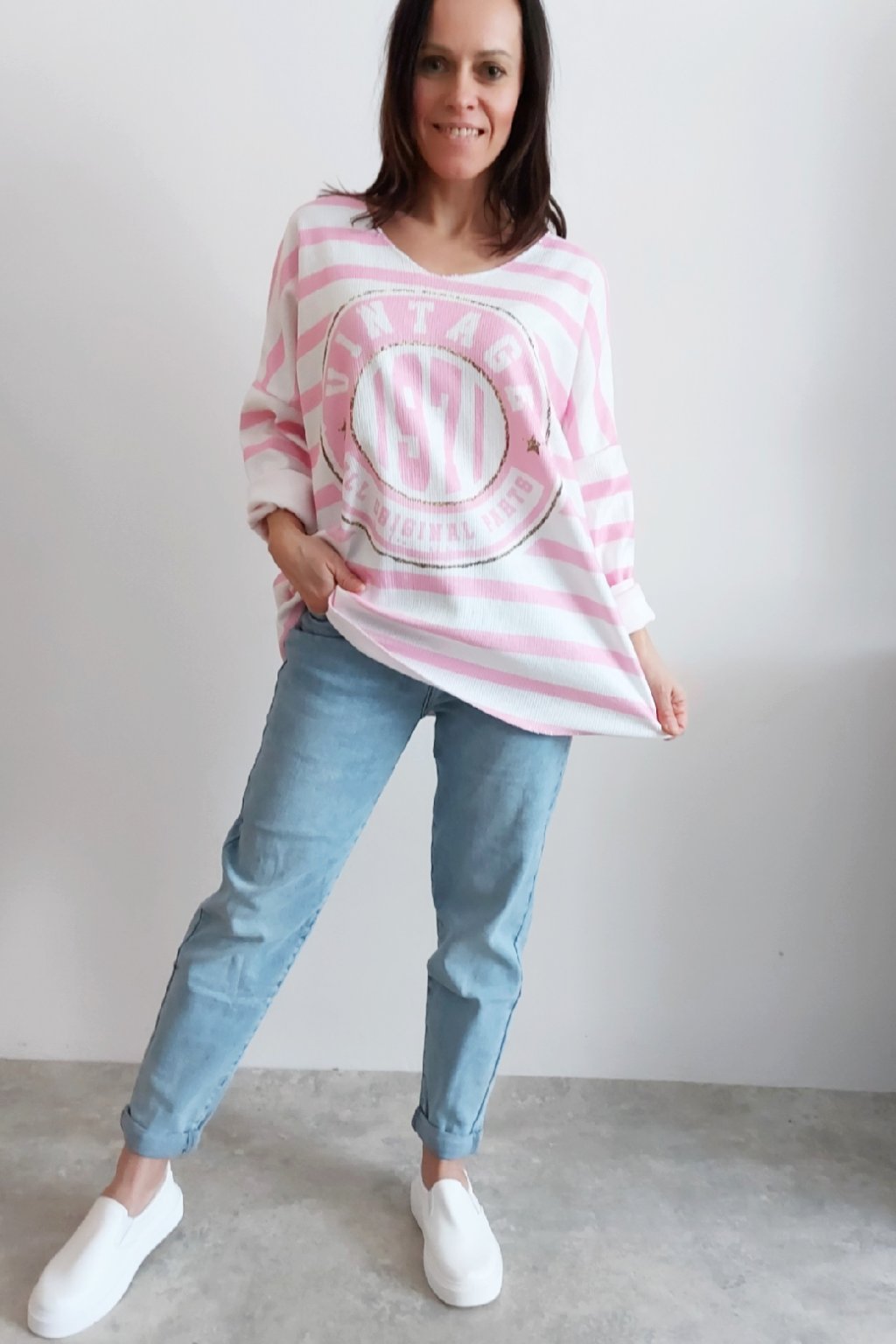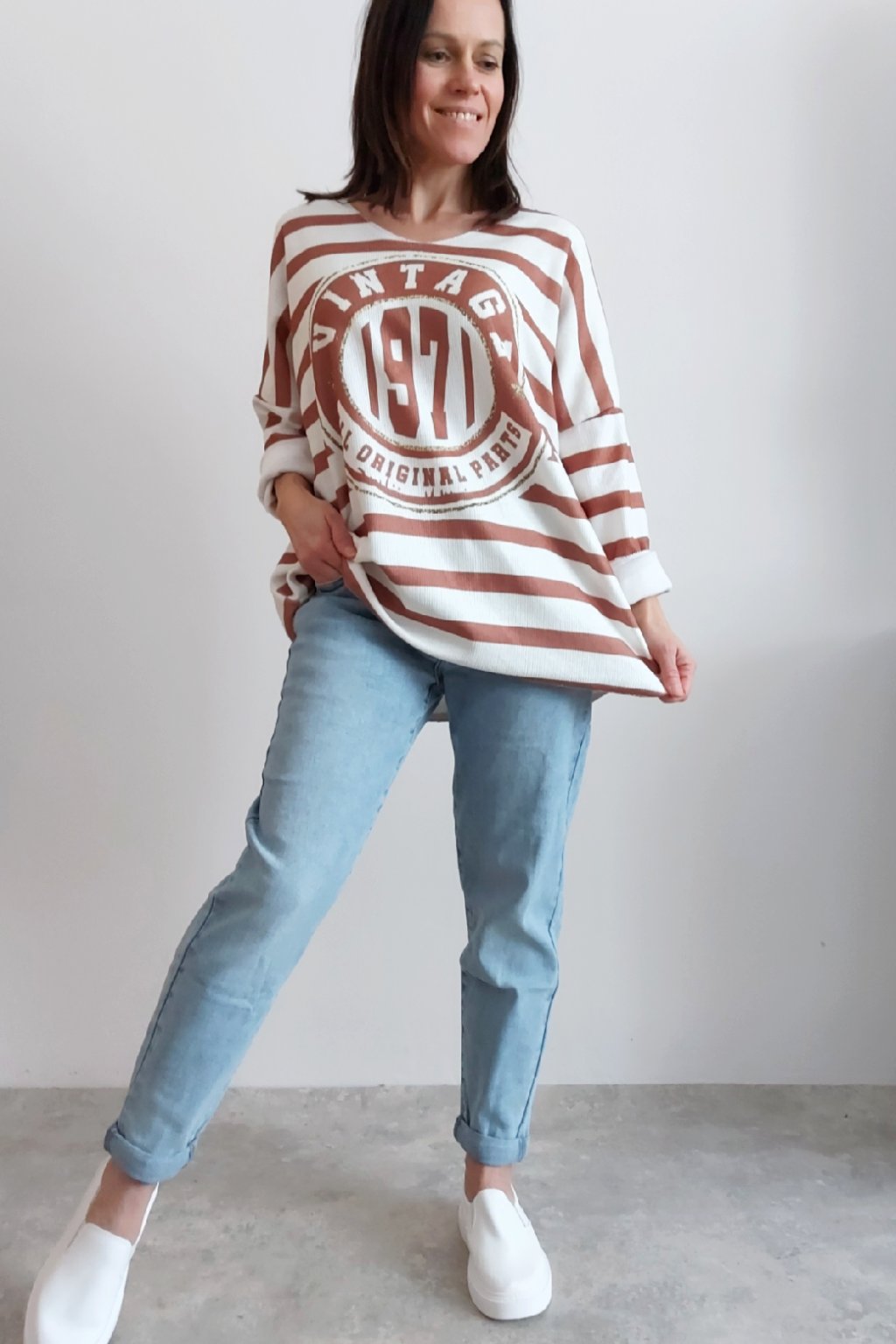 Skvělé triko ze silnějšího máslového materiálu. Véčkový výstřih. Motiv pruhů a nažehlený motiv s nápisem. Rukávy dlouhé. Rovný, volný střih. Nezapošité kraje, jen ustřižené. Materiál měkkoučký, máslový - hebký, na těle velmi příjemný. Foceno na vel. XS, výška 156cm.