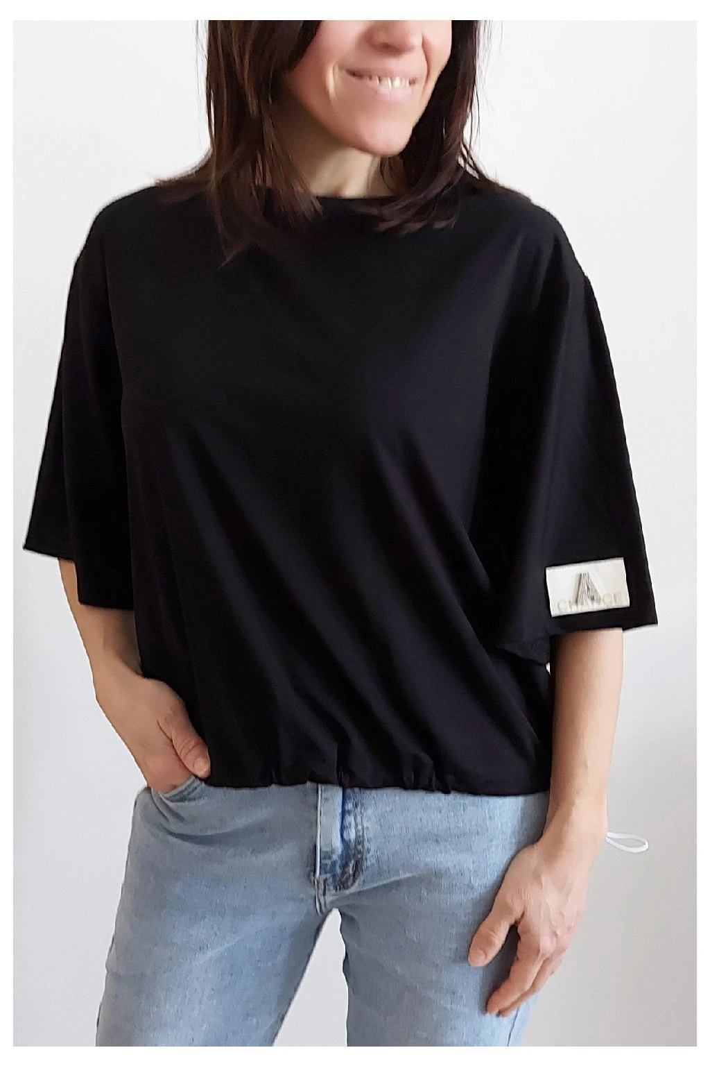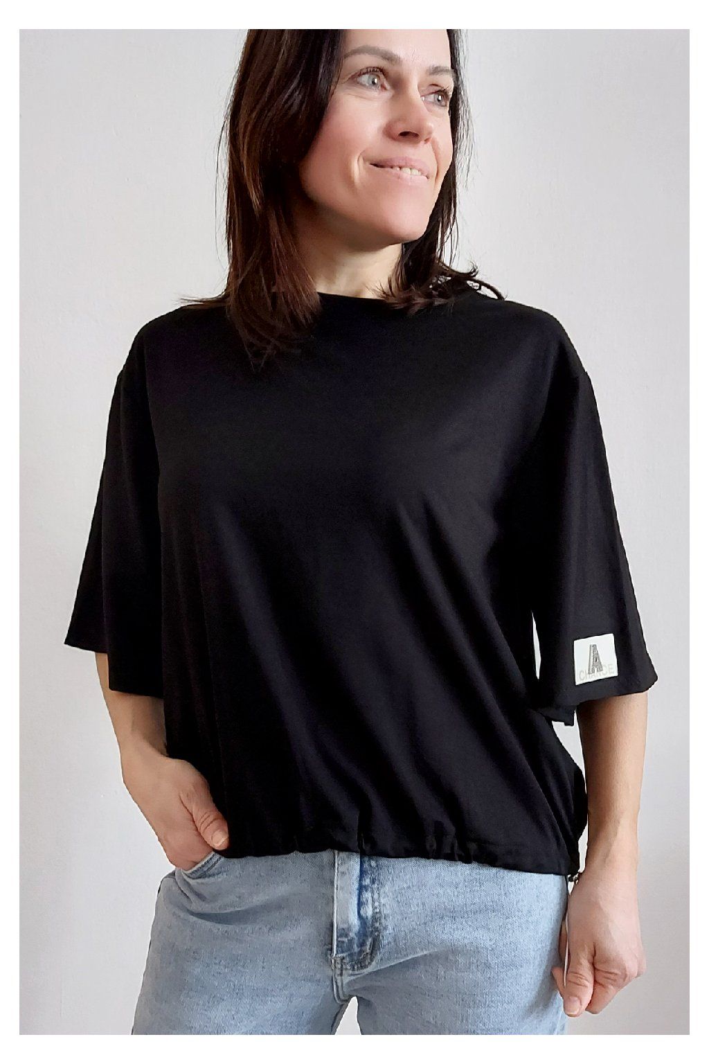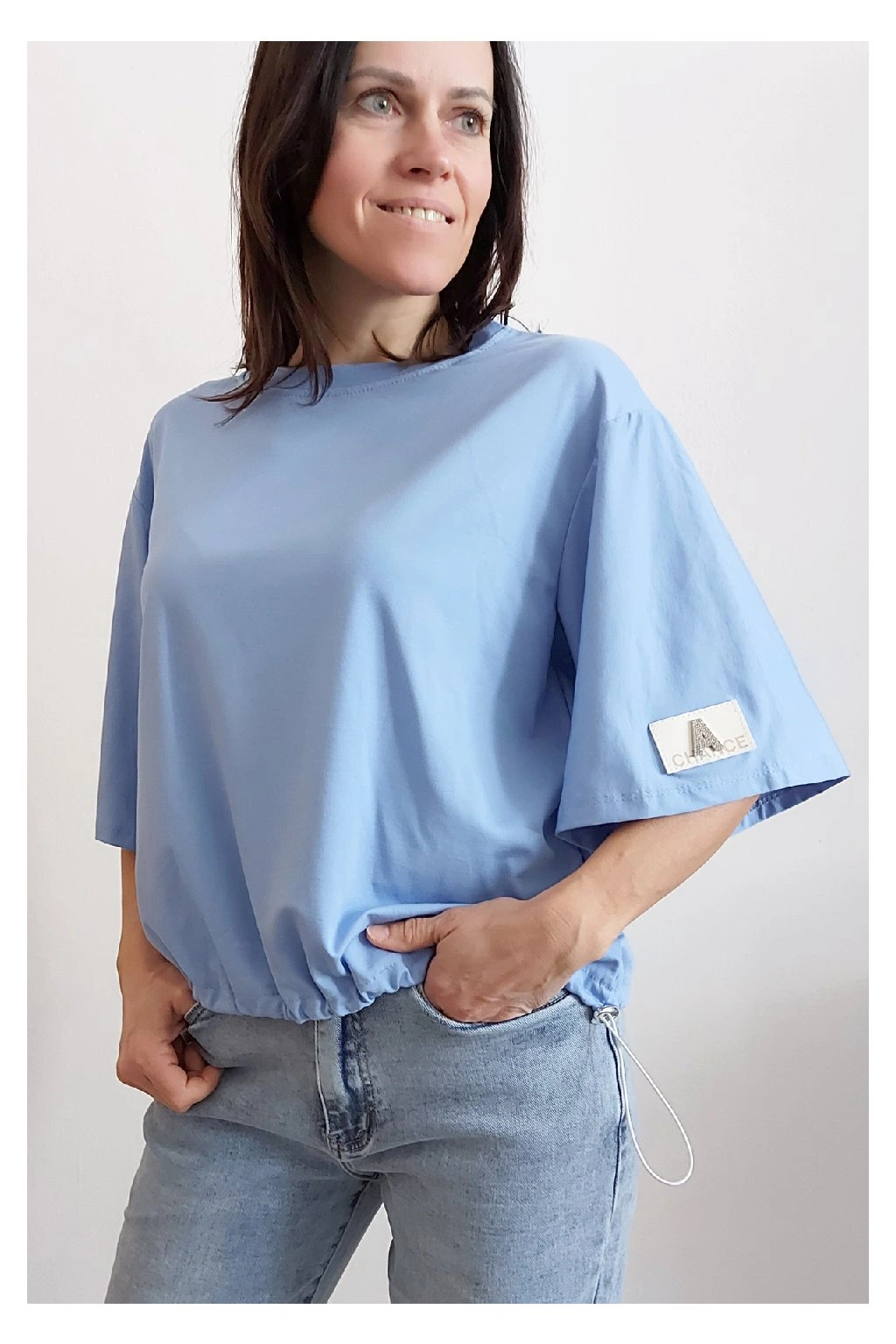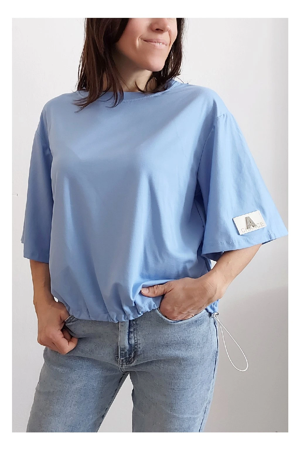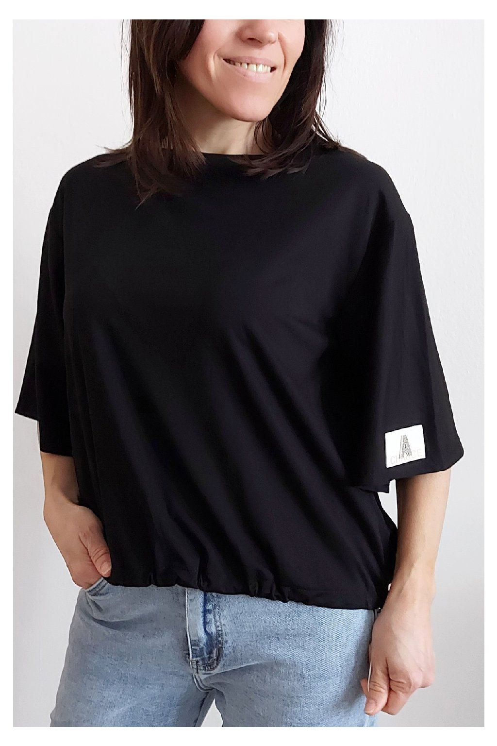 Tričko s krátkým rukávem. Na rukávu ozdobná nášivka s nápisem a písmenem A s kamínků. Po spodním obvodu je elastická gumka, kterou lze po stranách stáhnout a upravit si tak obvod. Velmi kvalitní bavlněný a pružný materiál. Foceno na vel. XS, výška 156cm.