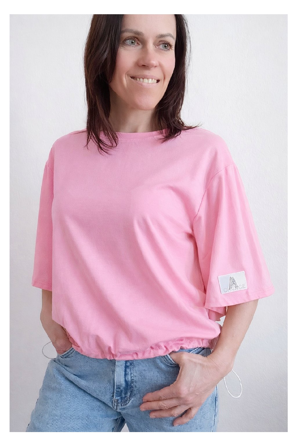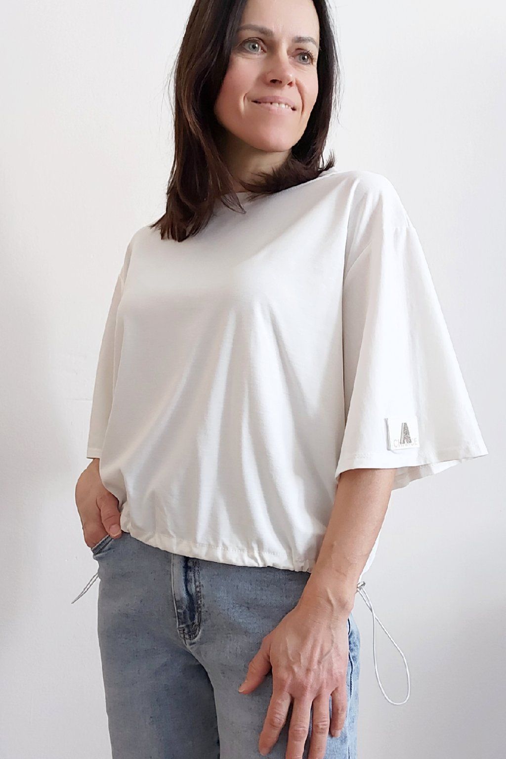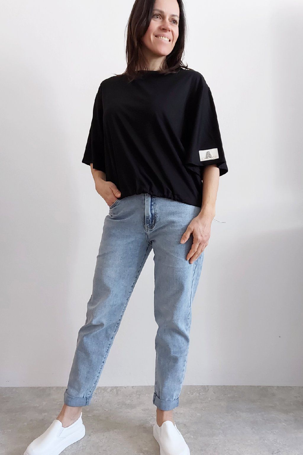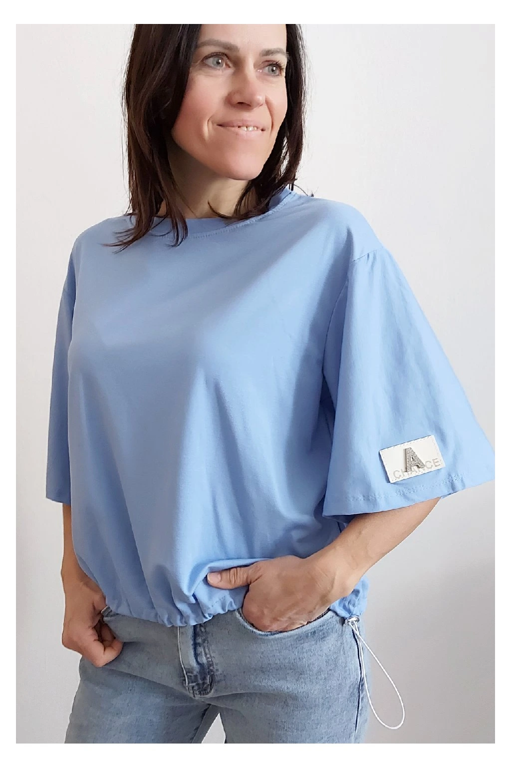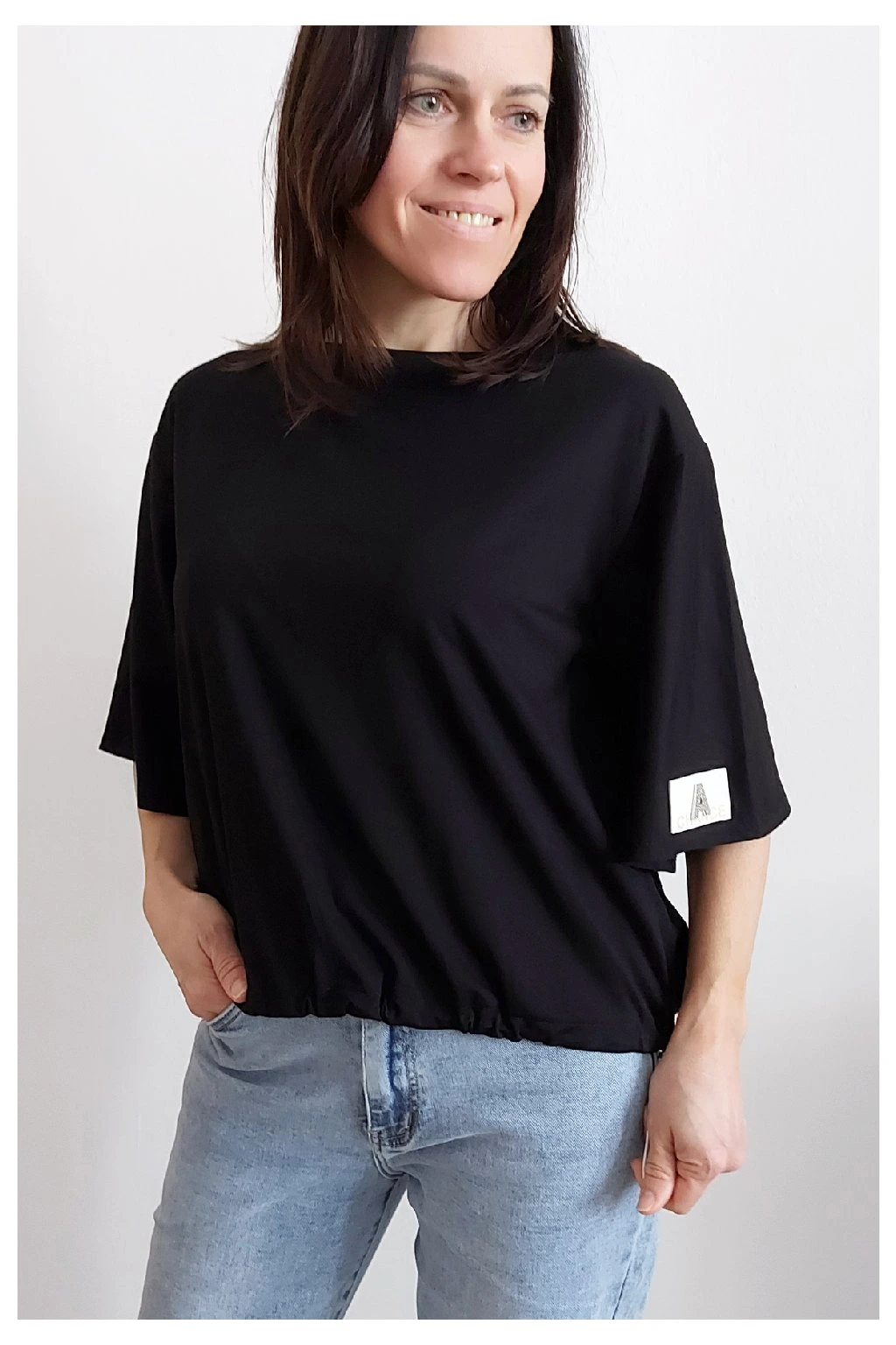 Tričko s krátkým rukávem. Na rukávu ozdobná nášivka s nápisem a písmenem A s kamínků. Po spodním obvodu je elastická gumka, kterou lze po stranách stáhnout a upravit si tak obvod. Velmi kvalitní bavlněný a pružný materiál. Foceno na vel. XS, výška 156cm.