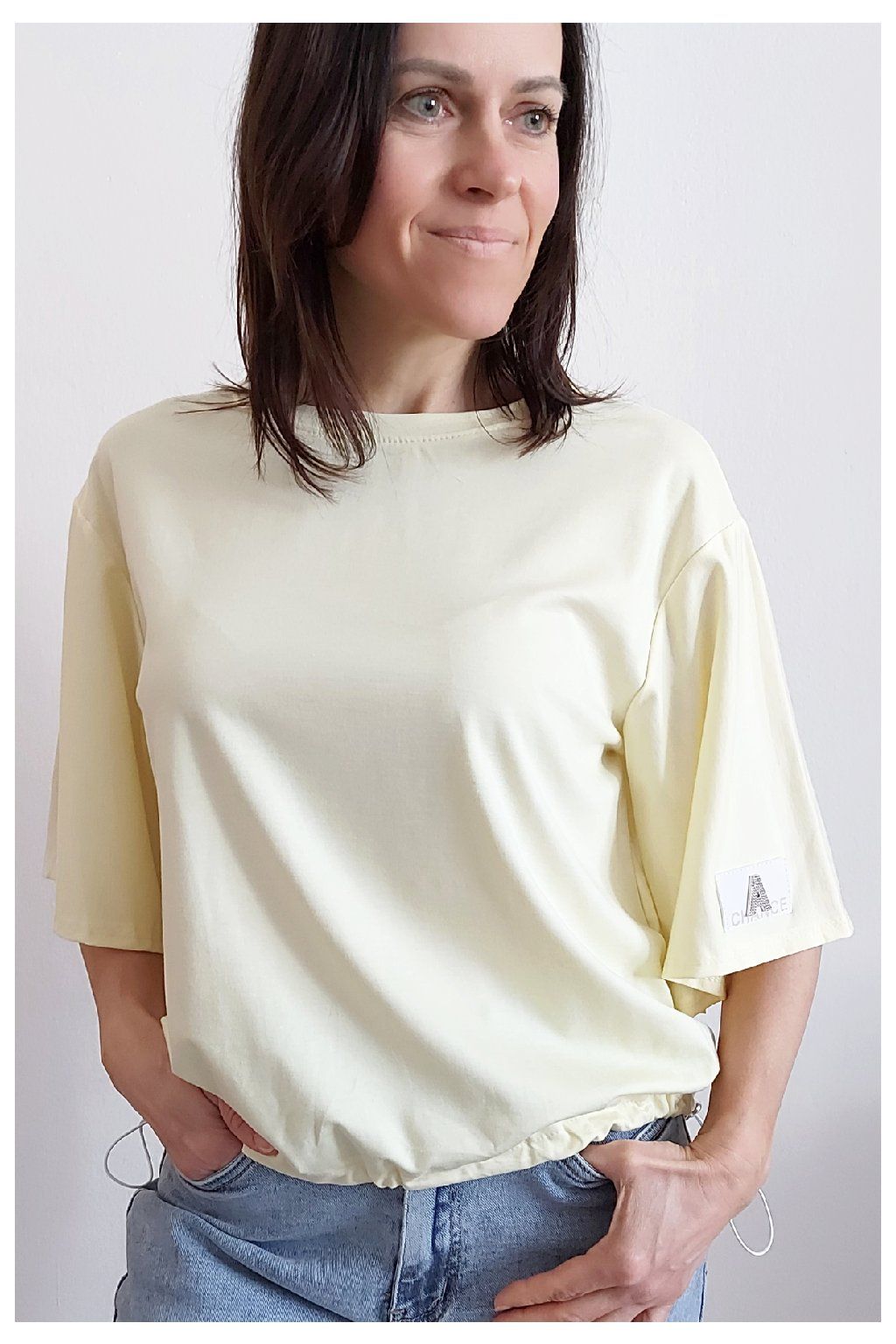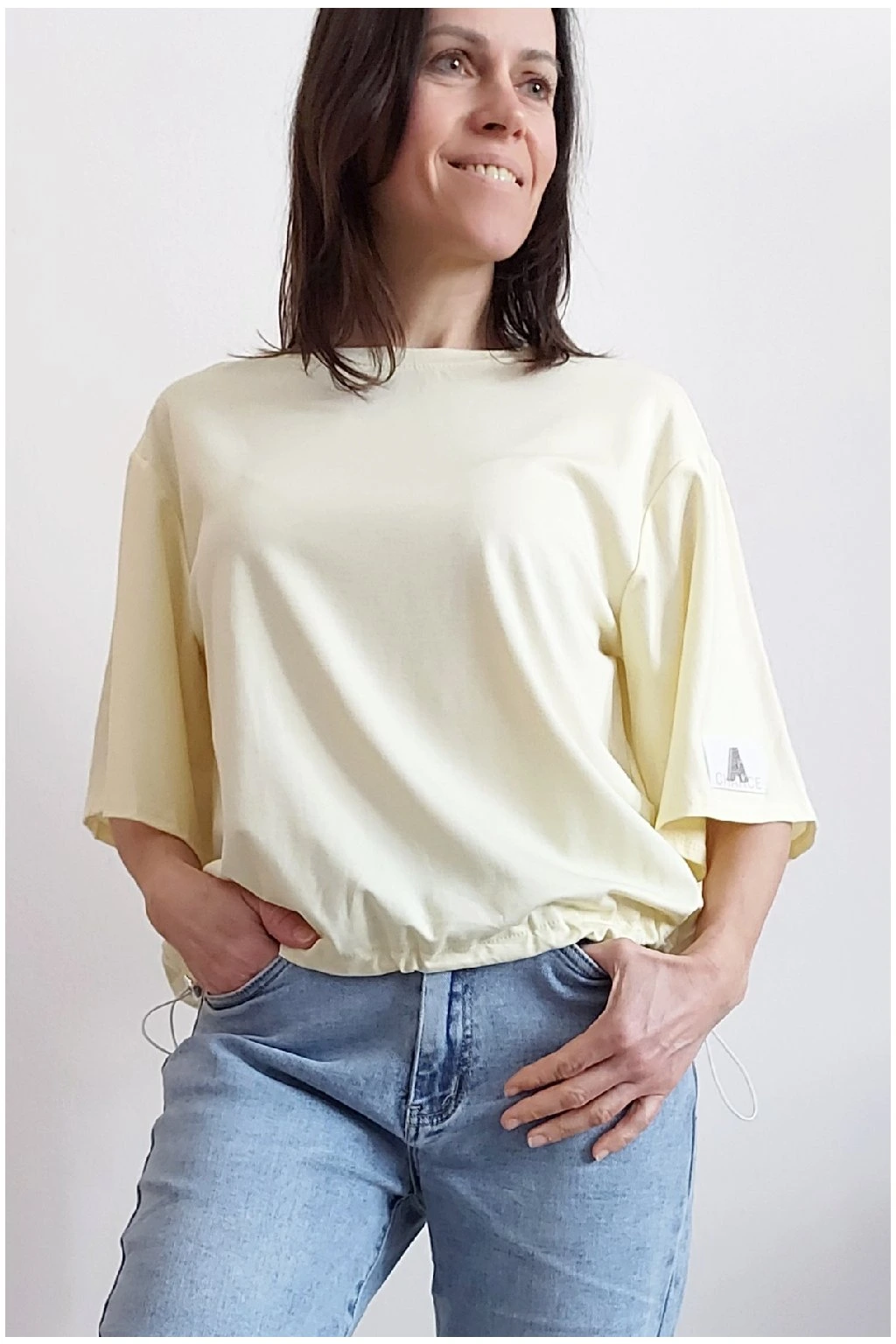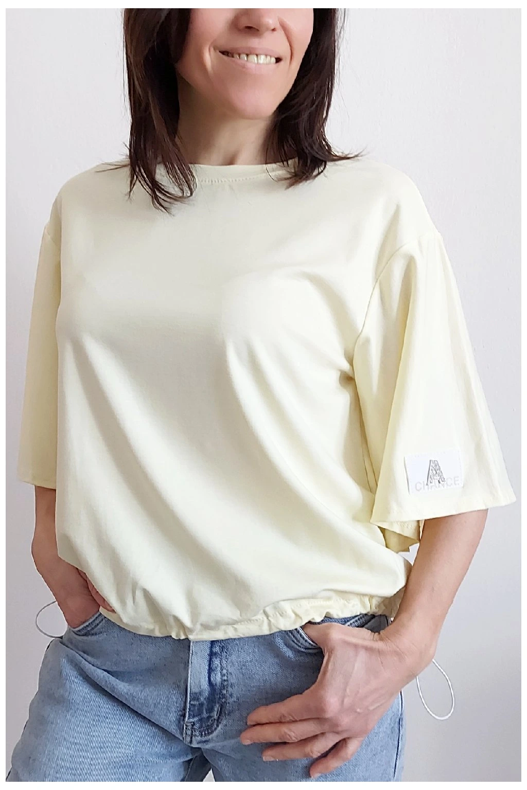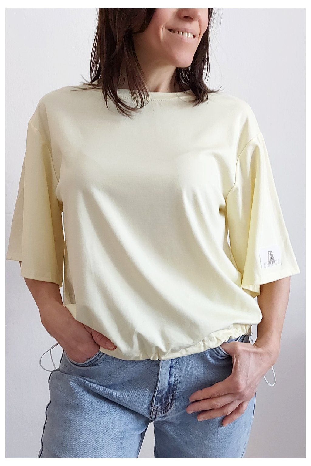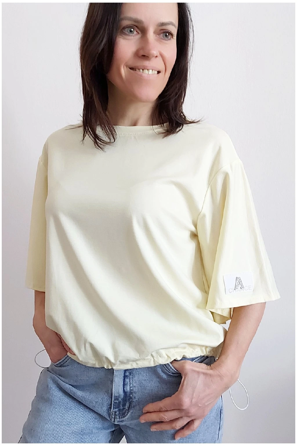 Tričko s krátkým rukávem. Na rukávu ozdobná nášivka s nápisem a písmenem A s kamínků. Po spodním obvodu je elastická gumka, kterou lze po stranách stáhnout a upravit si tak obvod. Velmi kvalitní bavlněný a pružný materiál. Foceno na vel. XS, výška 156cm.