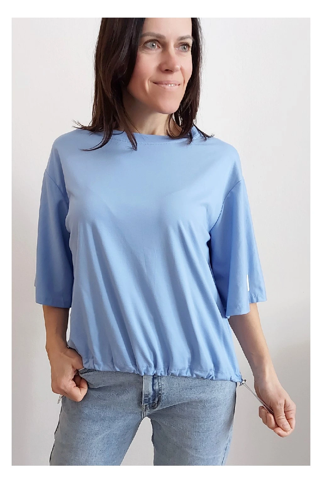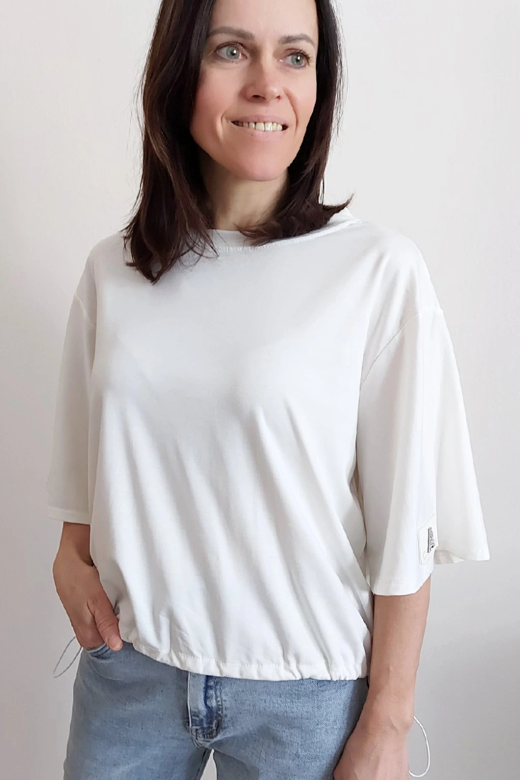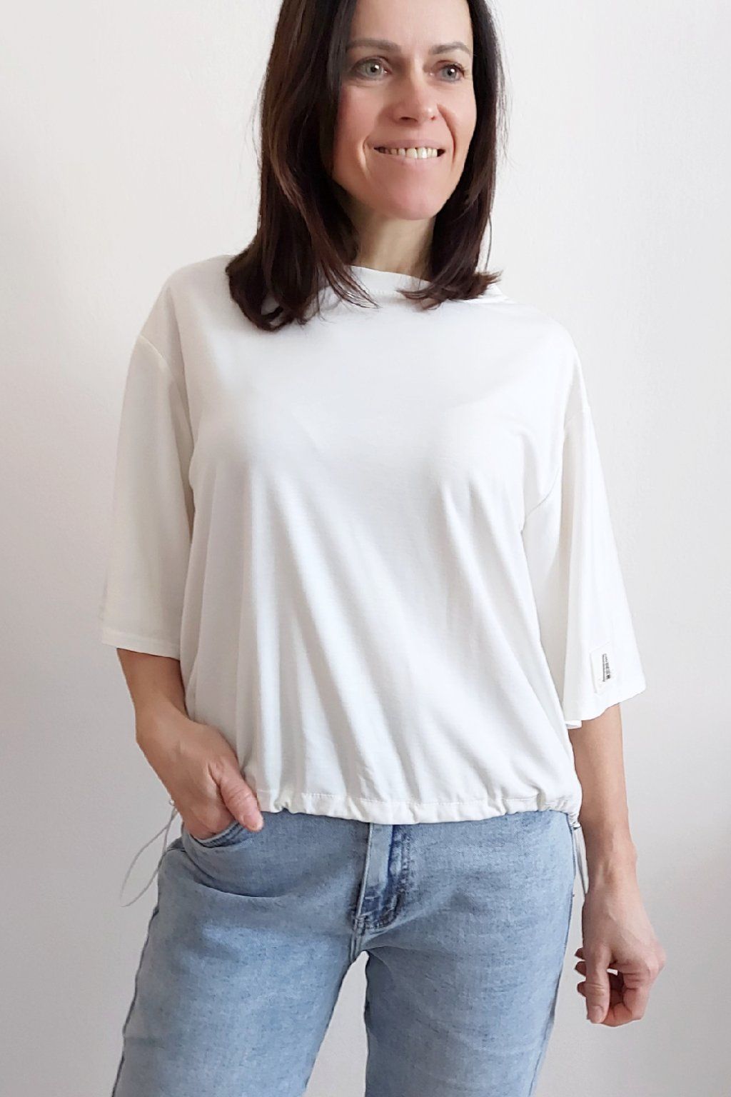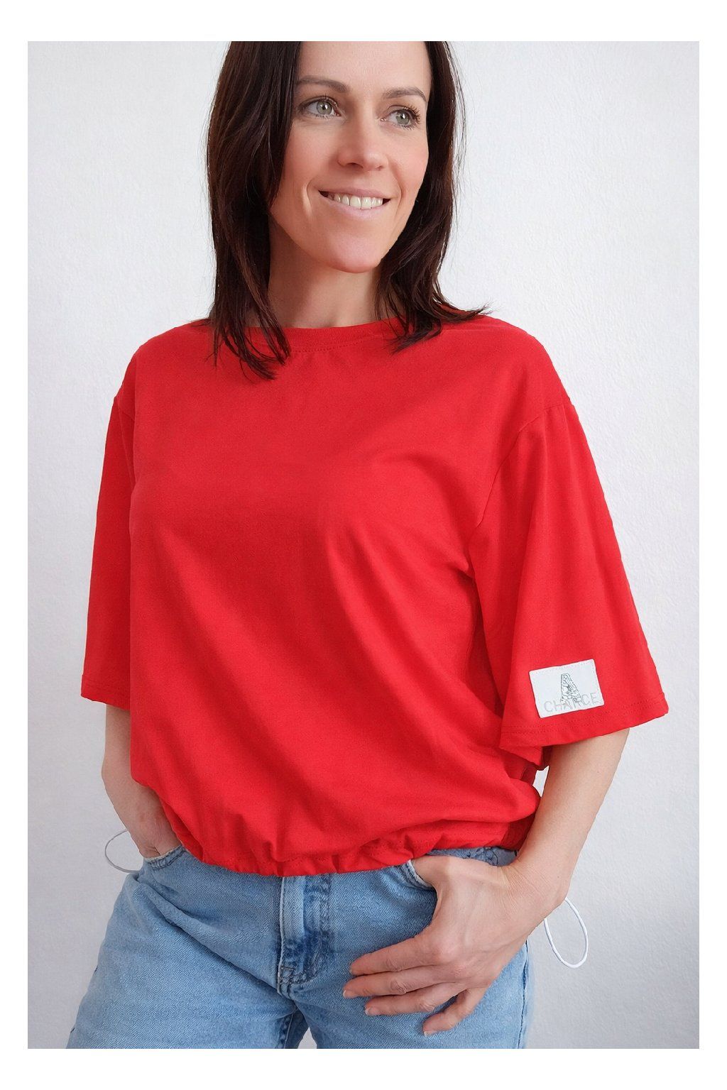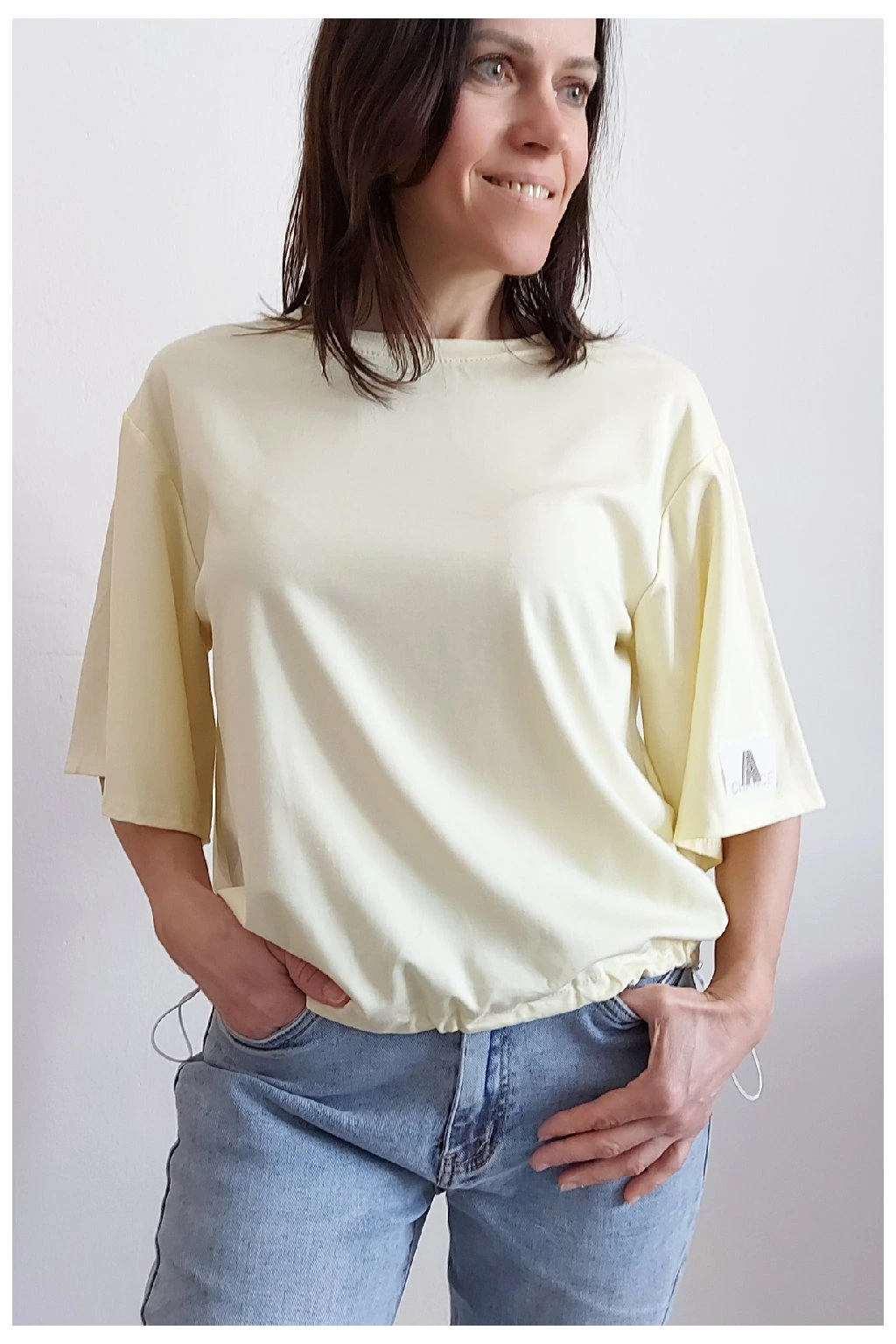 Tričko s krátkým rukávem. Na rukávu ozdobná nášivka s nápisem a písmenem A s kamínků. Po spodním obvodu je elastická gumka, kterou lze po stranách stáhnout a upravit si tak obvod. Velmi kvalitní bavlněný a pružný materiál. Foceno na vel. XS, výška 156cm.
