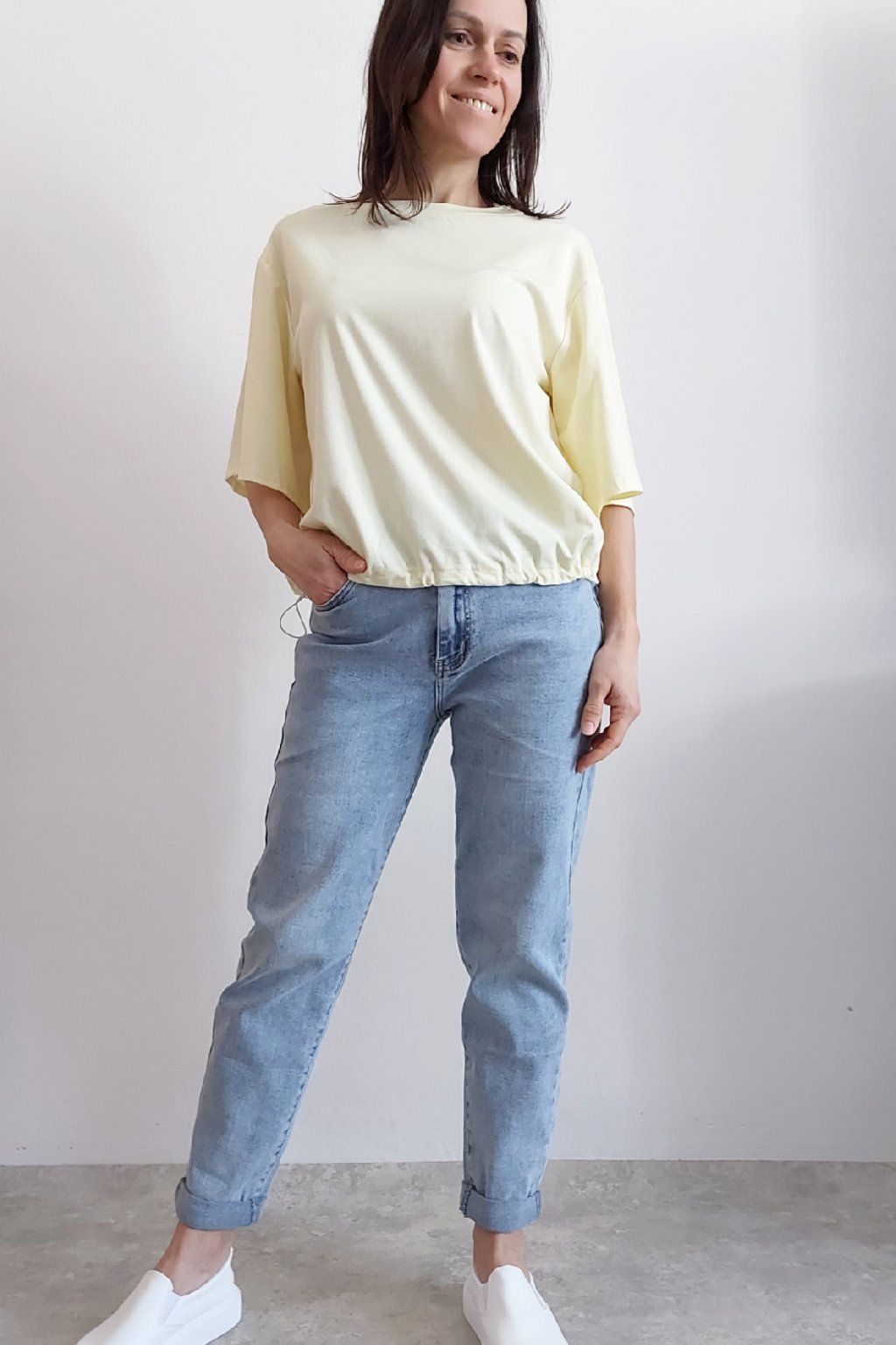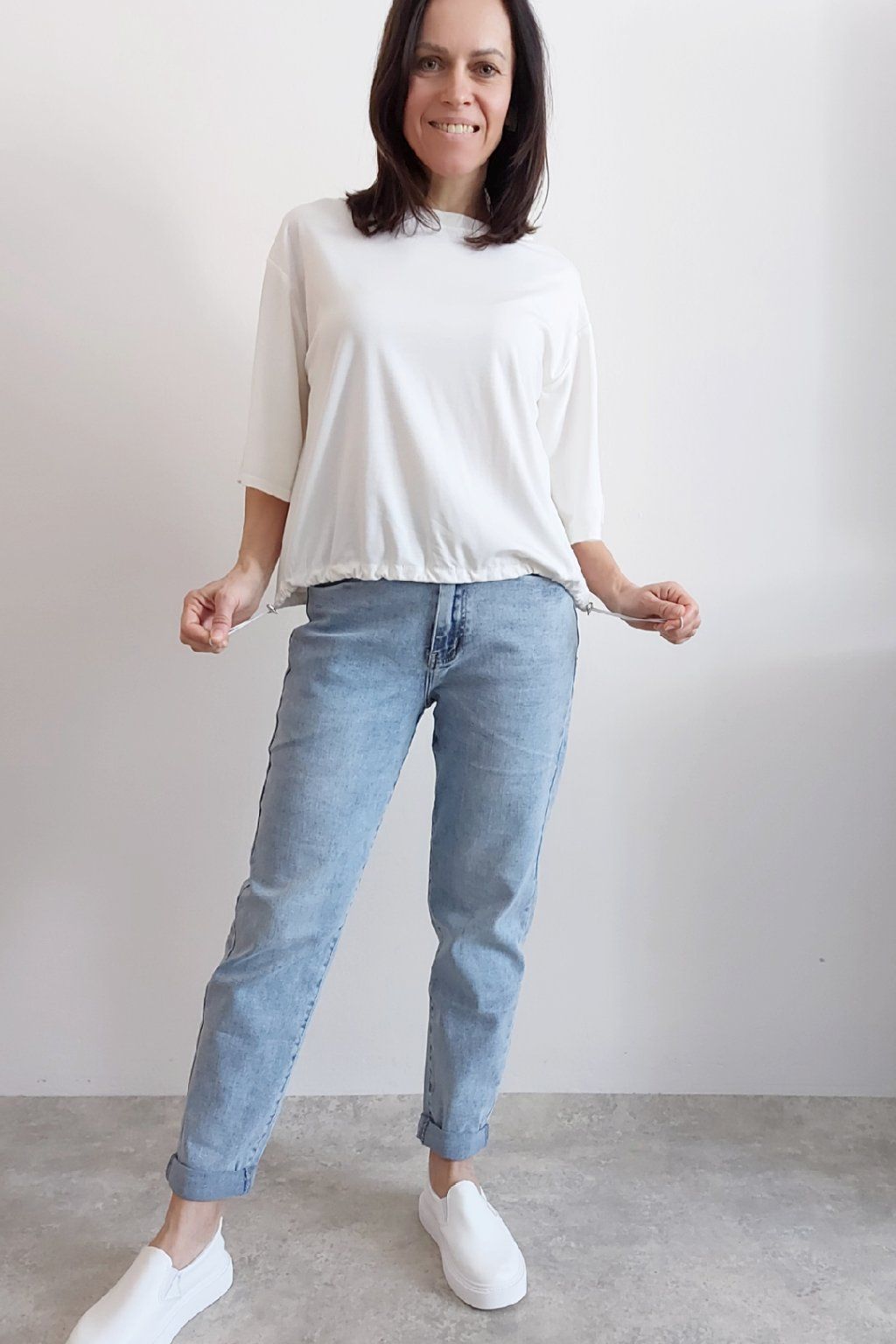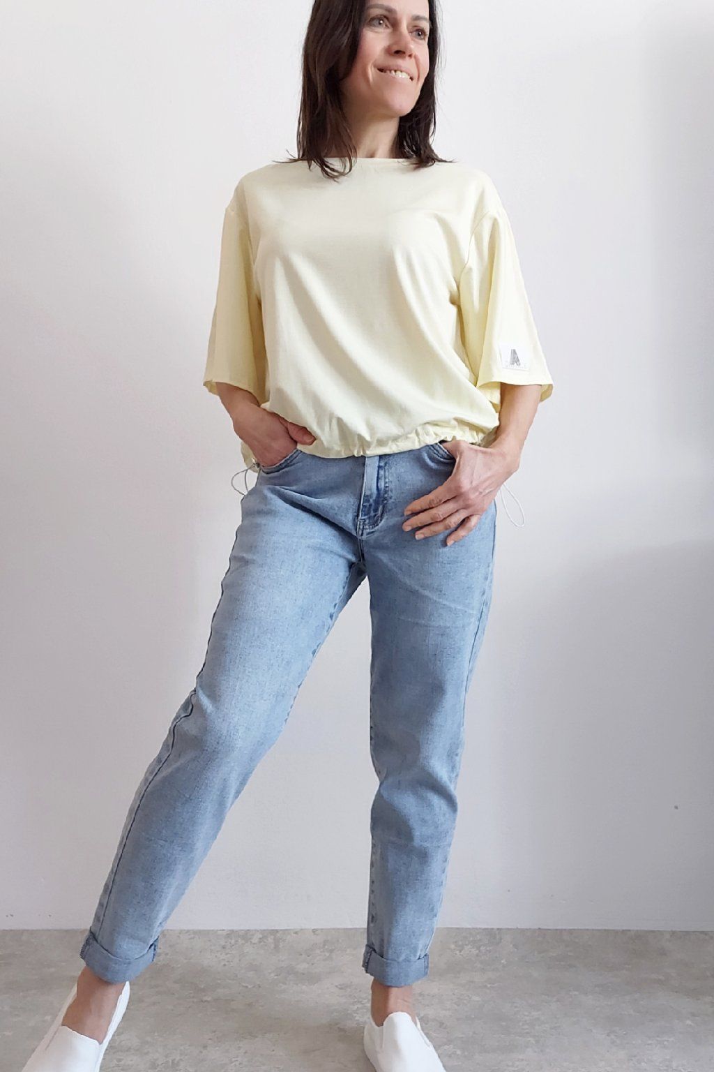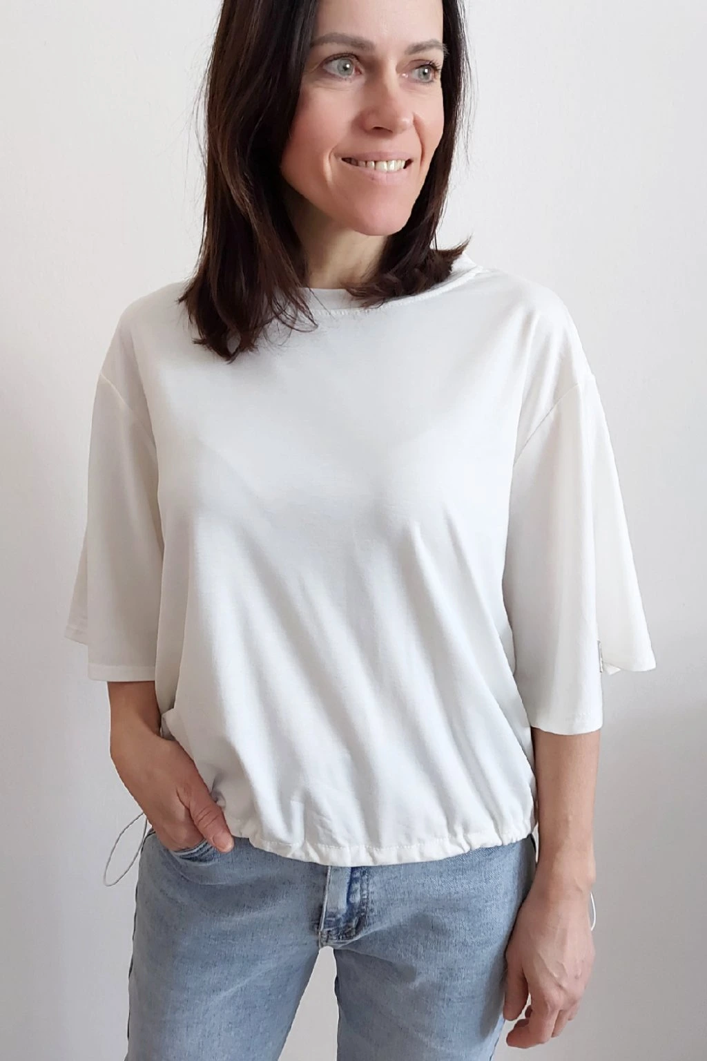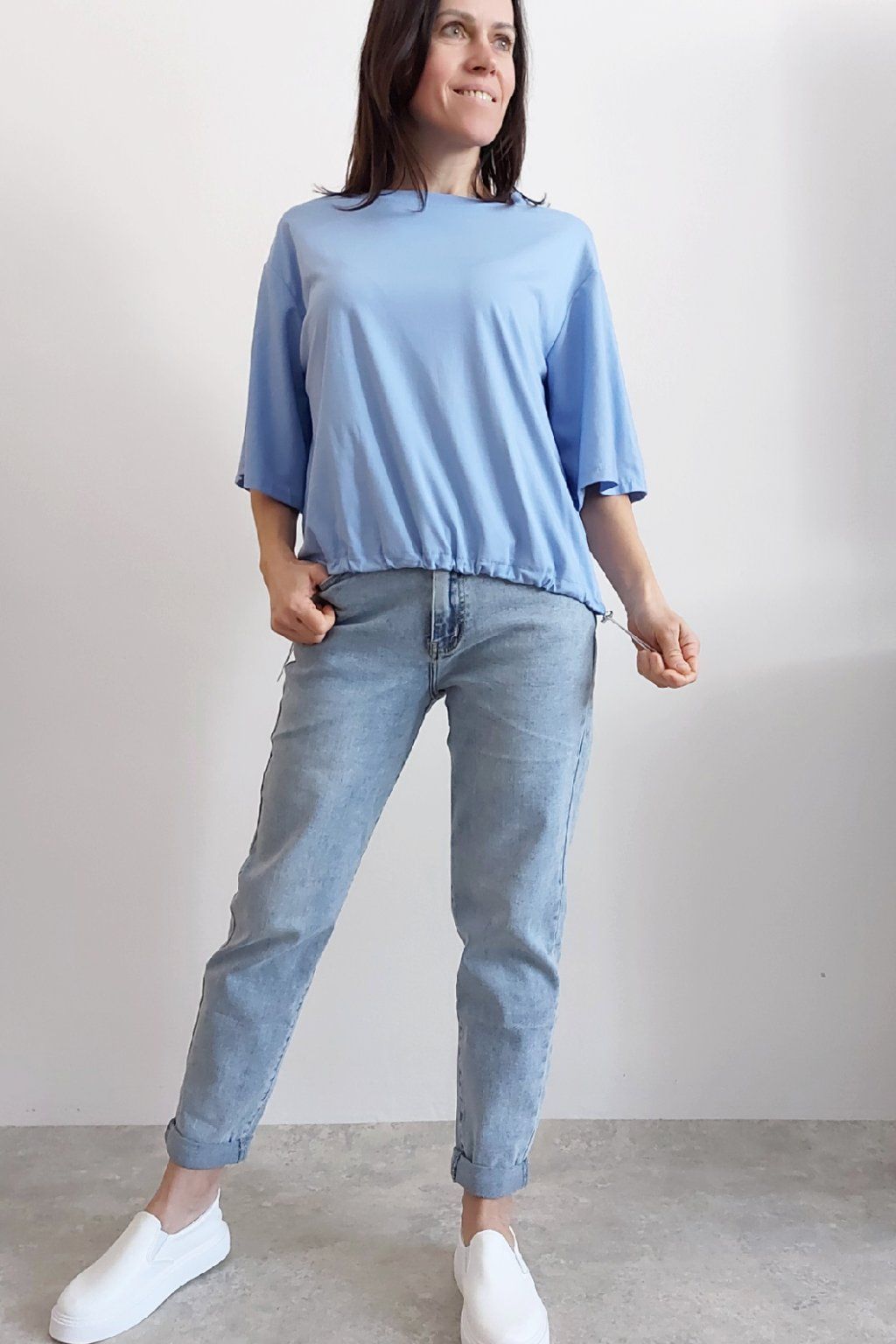 Tričko s krátkým rukávem. Na rukávu ozdobná nášivka s nápisem a písmenem A s kamínků. Po spodním obvodu je elastická gumka, kterou lze po stranách stáhnout a upravit si tak obvod. Velmi kvalitní bavlněný a pružný materiál. Foceno na vel. XS, výška 156cm.