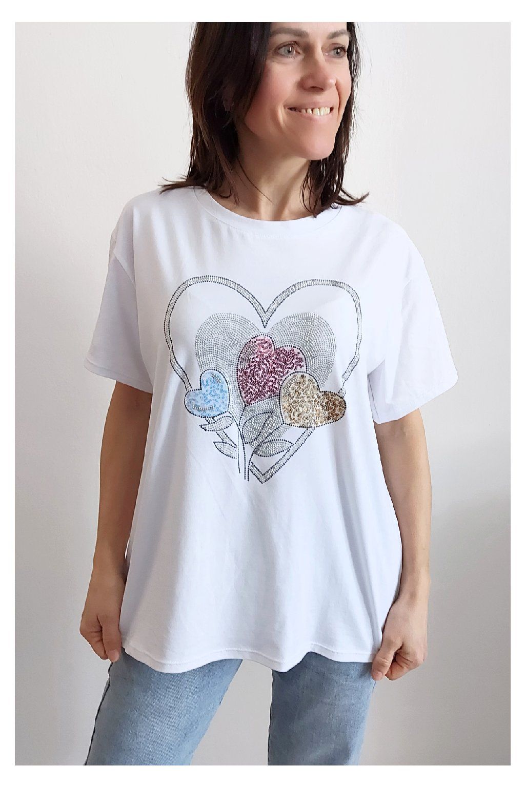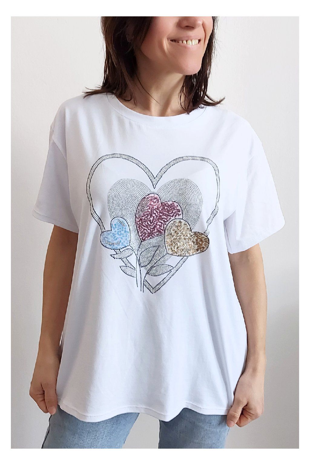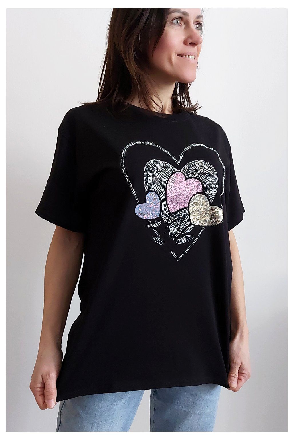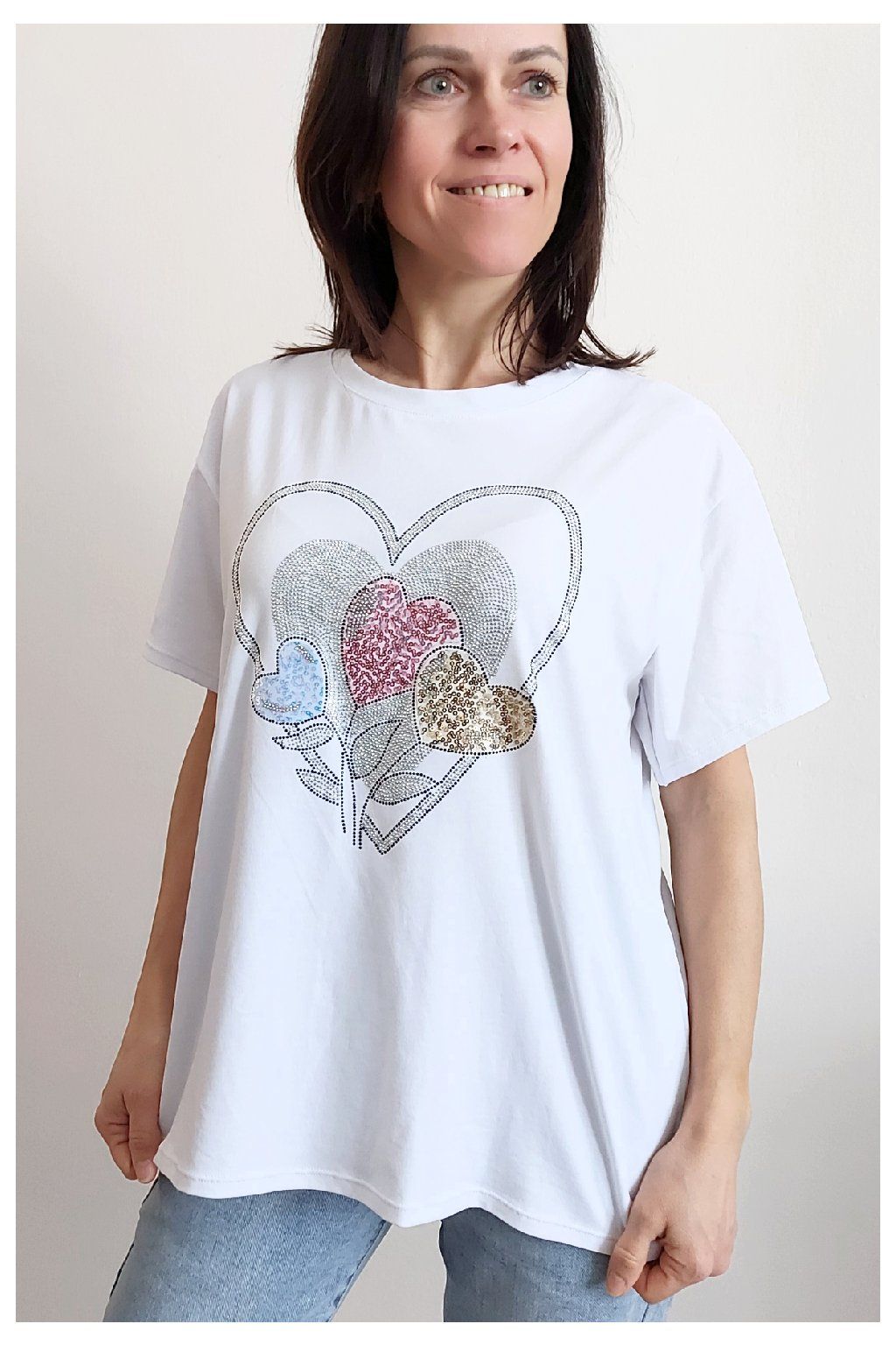 Tričko z vysoce kvalitního materiálu s nažehleným motivem, místy zdobený kamínky. Rukávy krátké. Bavlna vyšší gramáže - kvalitní, pružný materiál. Foceno na vel. XS, výška 156cm i na vel. 2XL (prsa 116cm, pas 104cm, boky 120cm), výška 165cm.