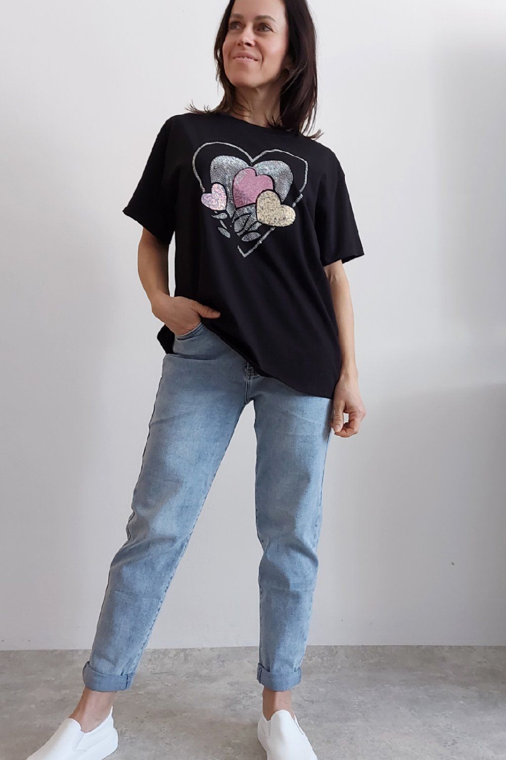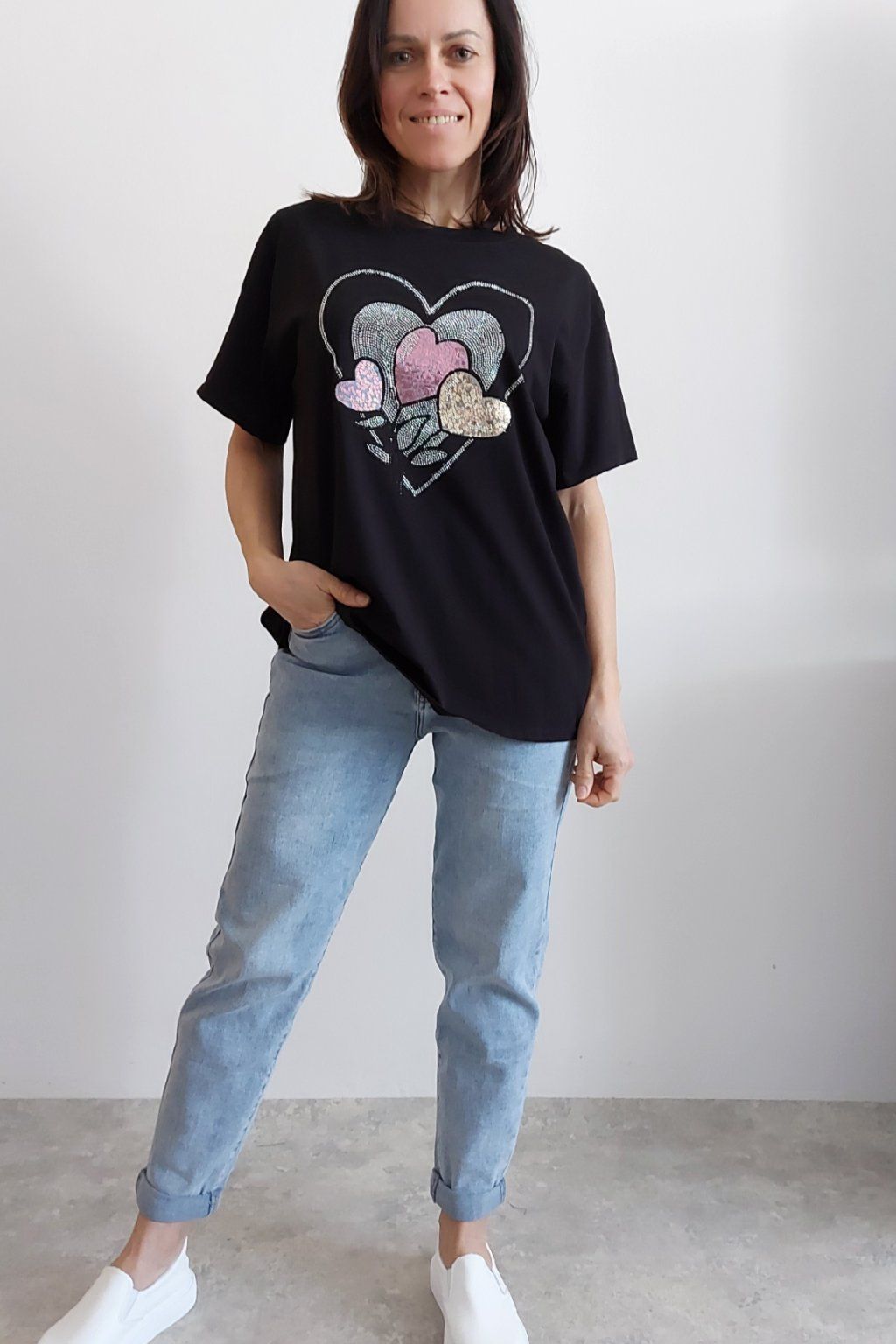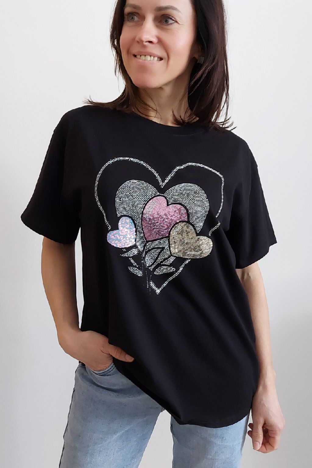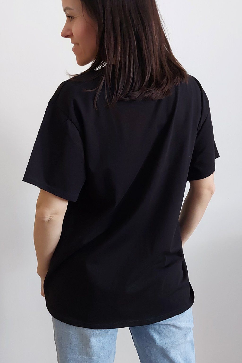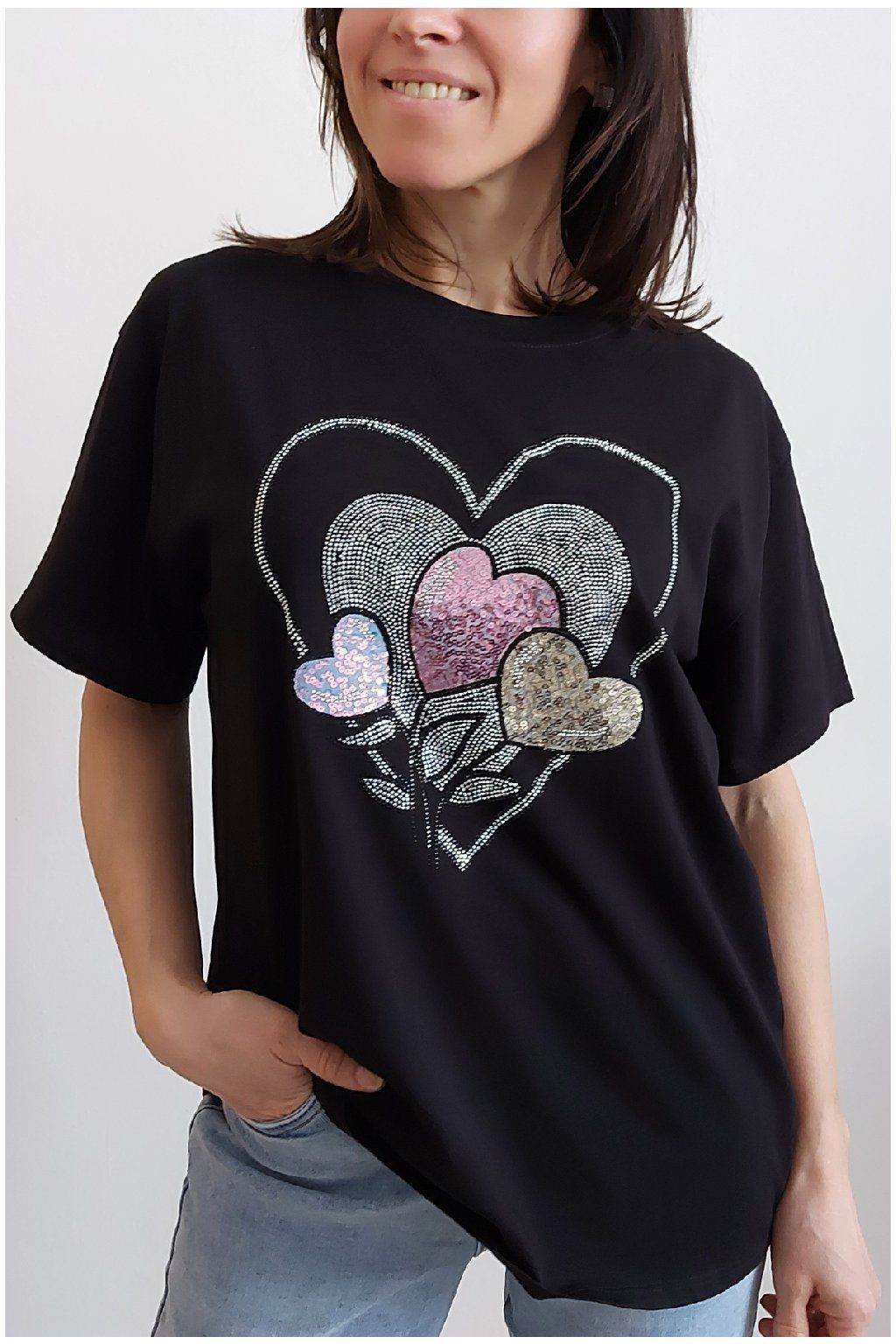 Tričko z vysoce kvalitního materiálu s nažehleným motivem, místy zdobený kamínky. Rukávy krátké. Bavlna vyšší gramáže - kvalitní, pružný materiál. Foceno na vel. XS, výška 156cm i na vel. 2XL (prsa 116cm, pas 104cm, boky 120cm), výška 165cm.
