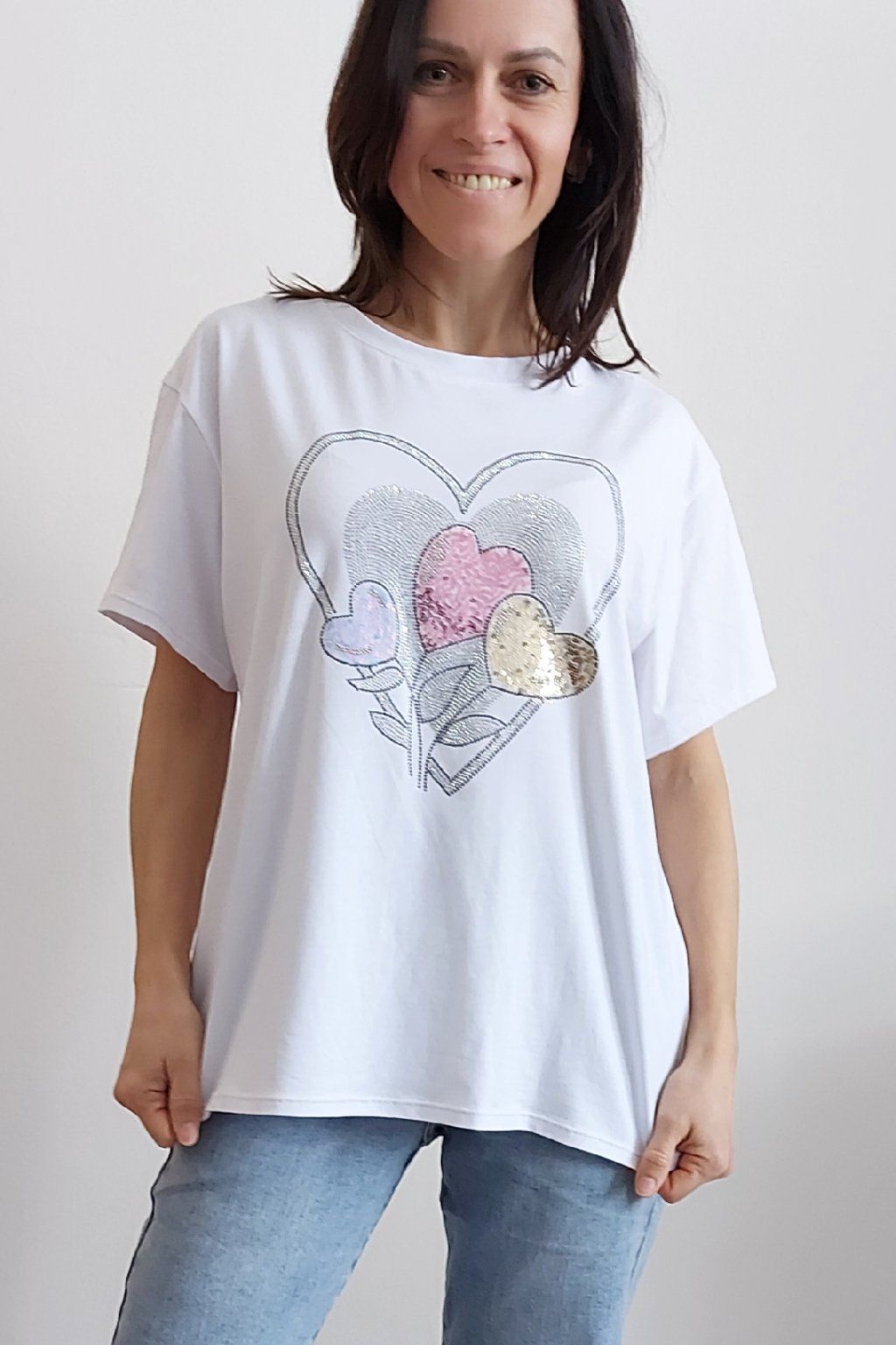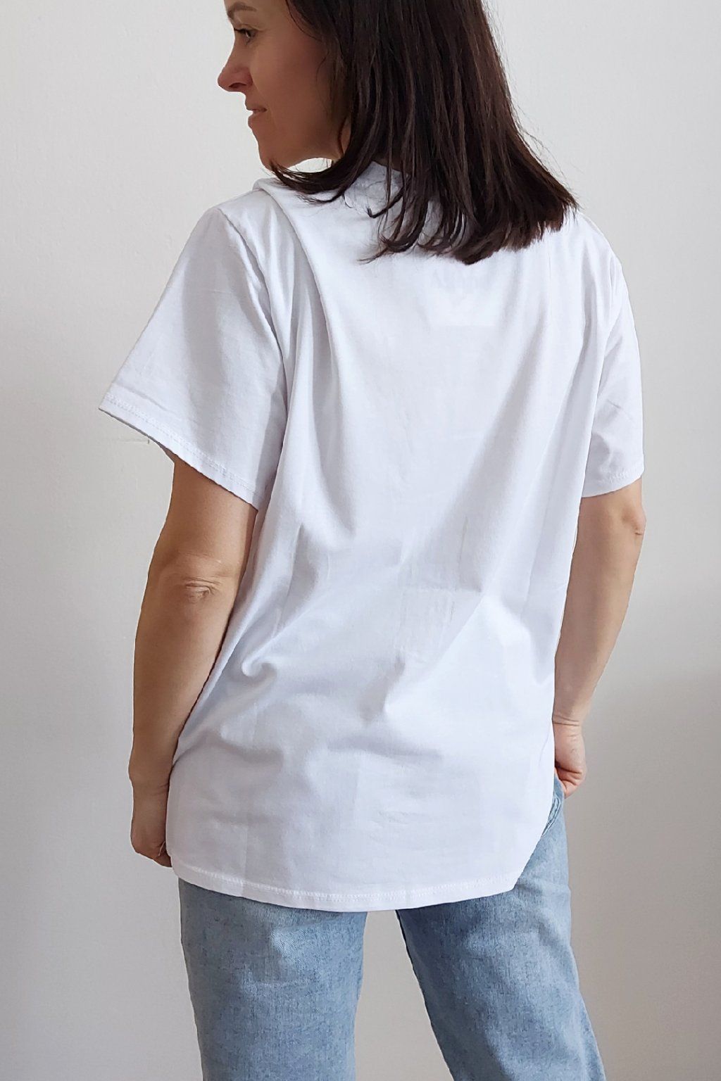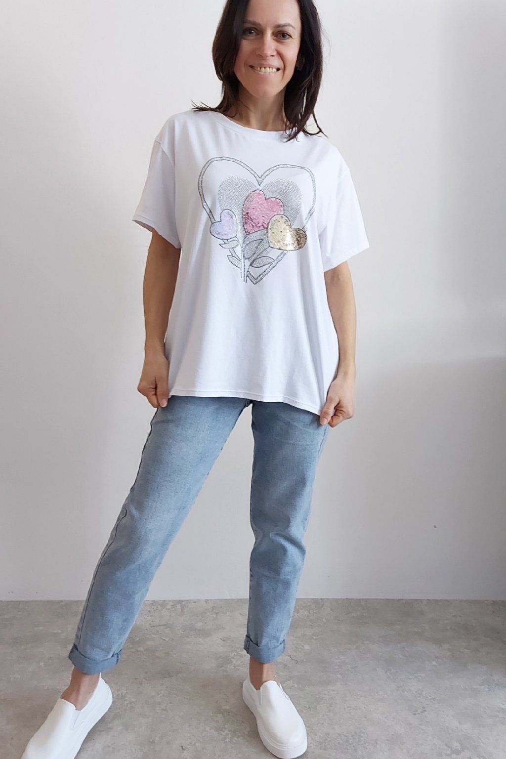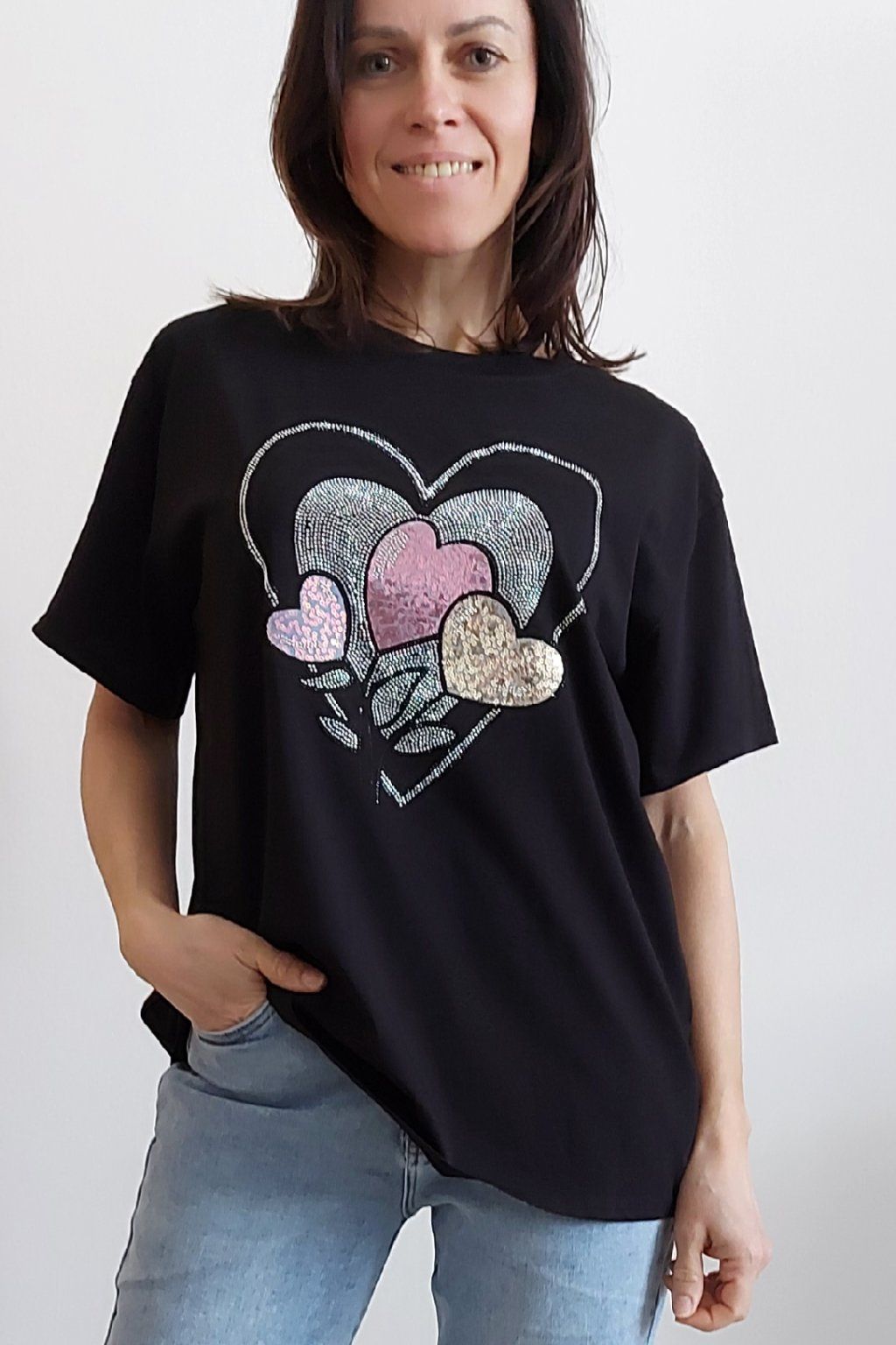 Tričko z vysoce kvalitního materiálu s nažehleným motivem, místy zdobený kamínky. Rukávy krátké. Bavlna vyšší gramáže - kvalitní, pružný materiál. Foceno na vel. XS, výška 156cm i na vel. 2XL (prsa 116cm, pas 104cm, boky 120cm), výška 165cm.