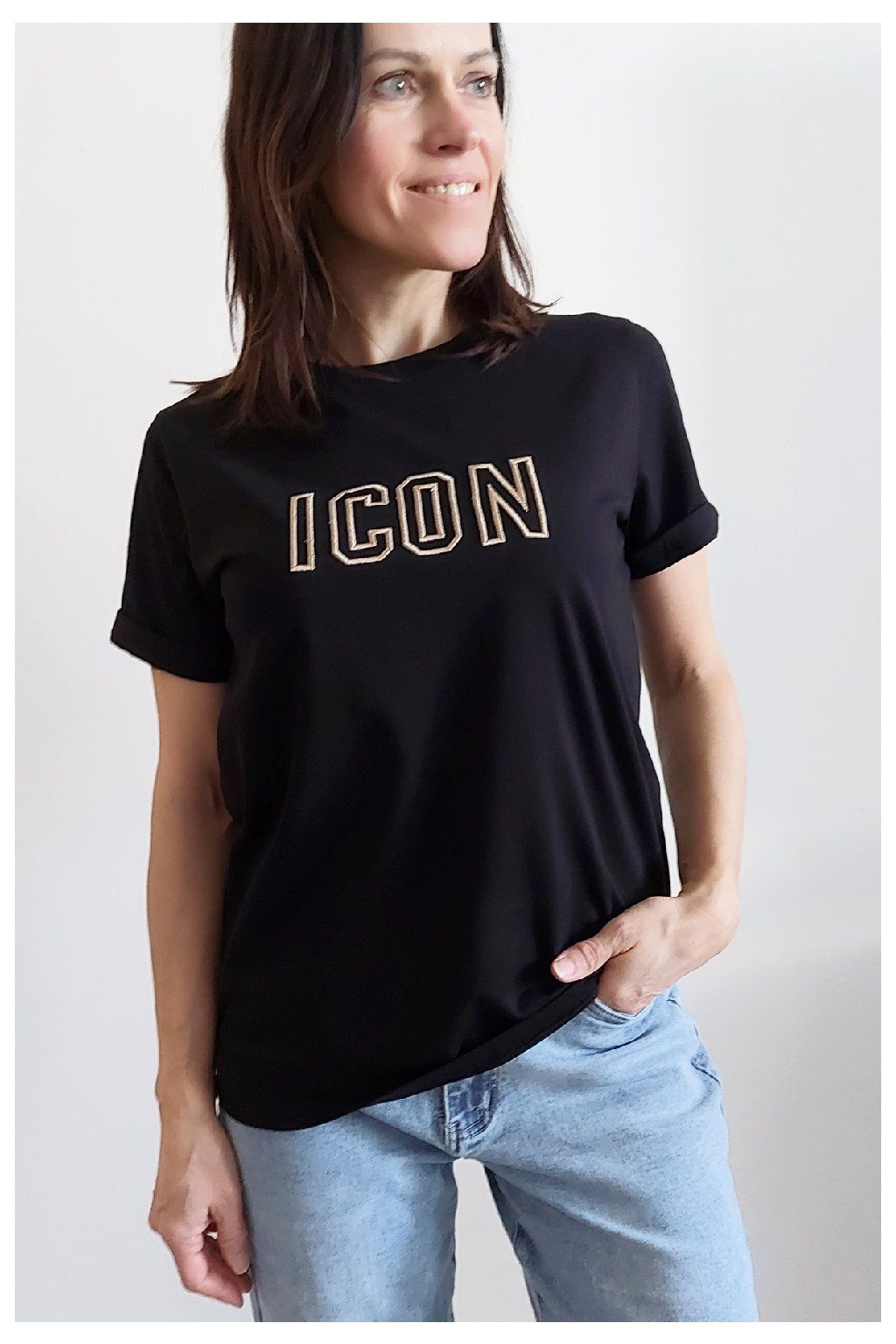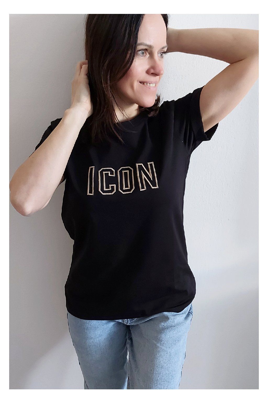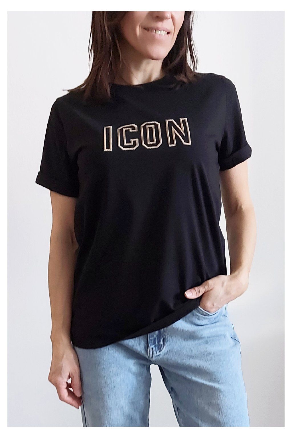 Tričko s vyšitým nápisem ICON. Rukávy krátké, jsou ukončené ohrnutím a to je zapošité. Bavlna vyšší gramáže - top kvalita. Foceno na vel. XS, výška 156cm.