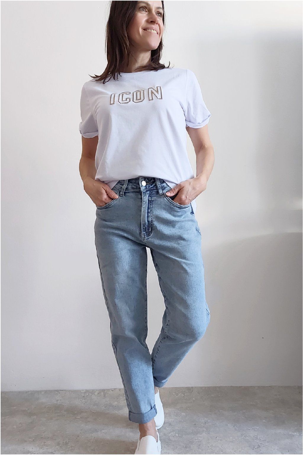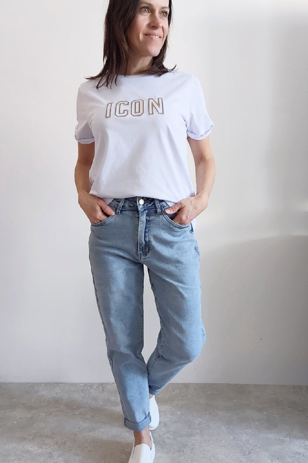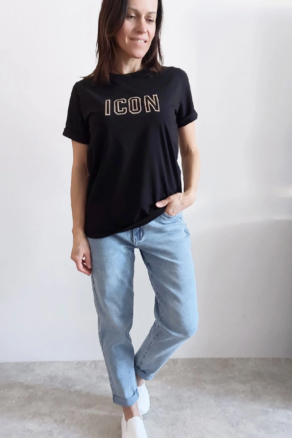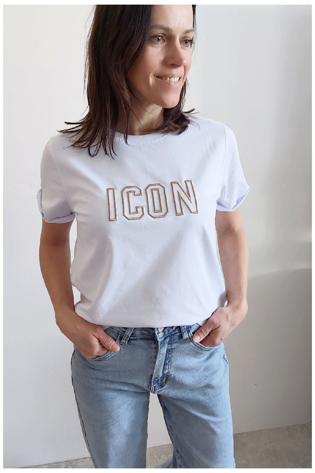 Tričko s vyšitým nápisem ICON. Rukávy krátké, jsou ukončené ohrnutím a to je zapošité. Bavlna vyšší gramáže - top kvalita. Foceno na vel. XS, výška 156cm.