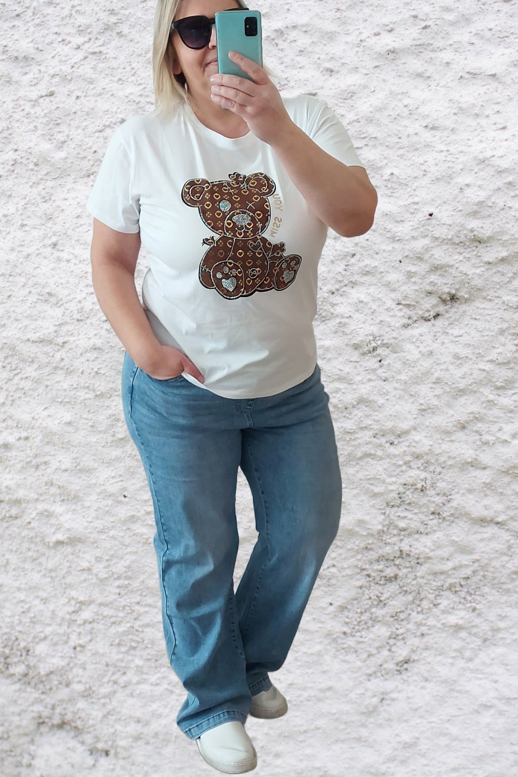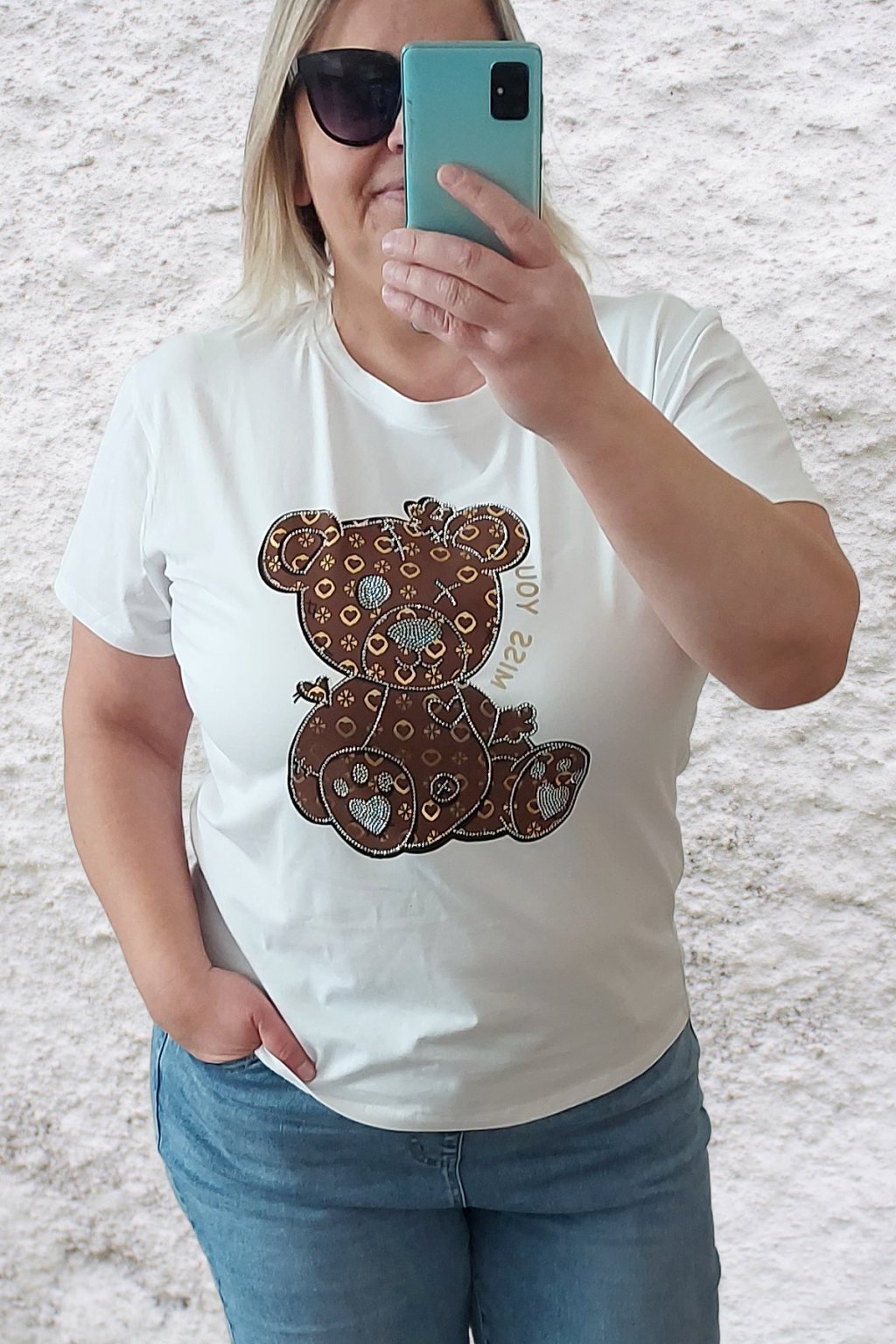 Tričko z vysoce kvalitního materiálu s nažehleným motivem, místy zdobený kamínky. Rukávy krátké. Bavlna vyšší gramáže - kvalitní, pružný materiál.  Foceno na vel. 2XL (prsa 116cm, pas 104cm, boky 120cm), výška 165cm.