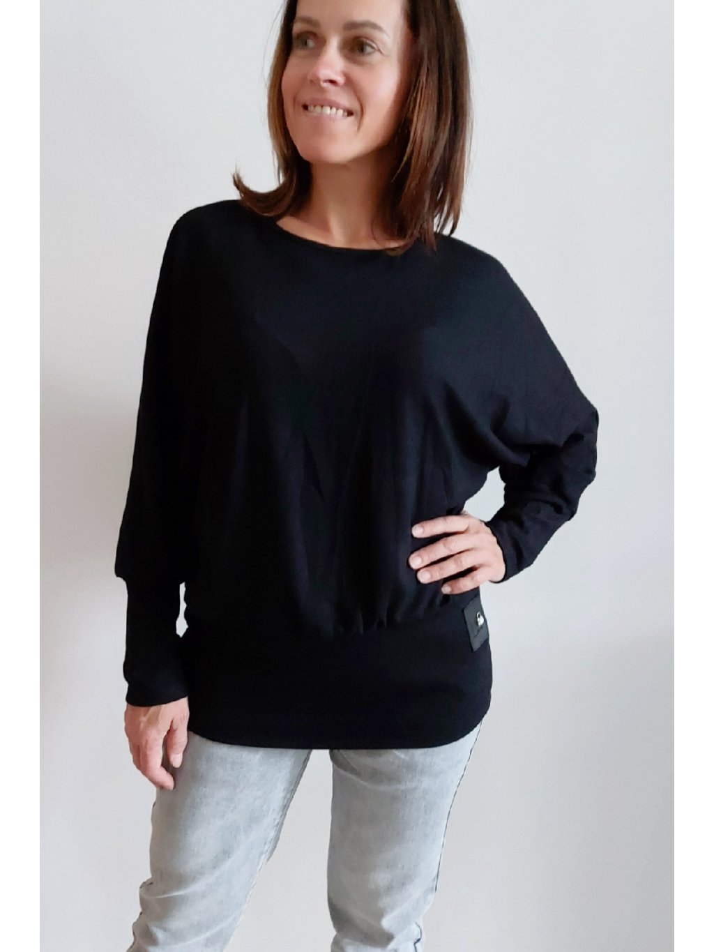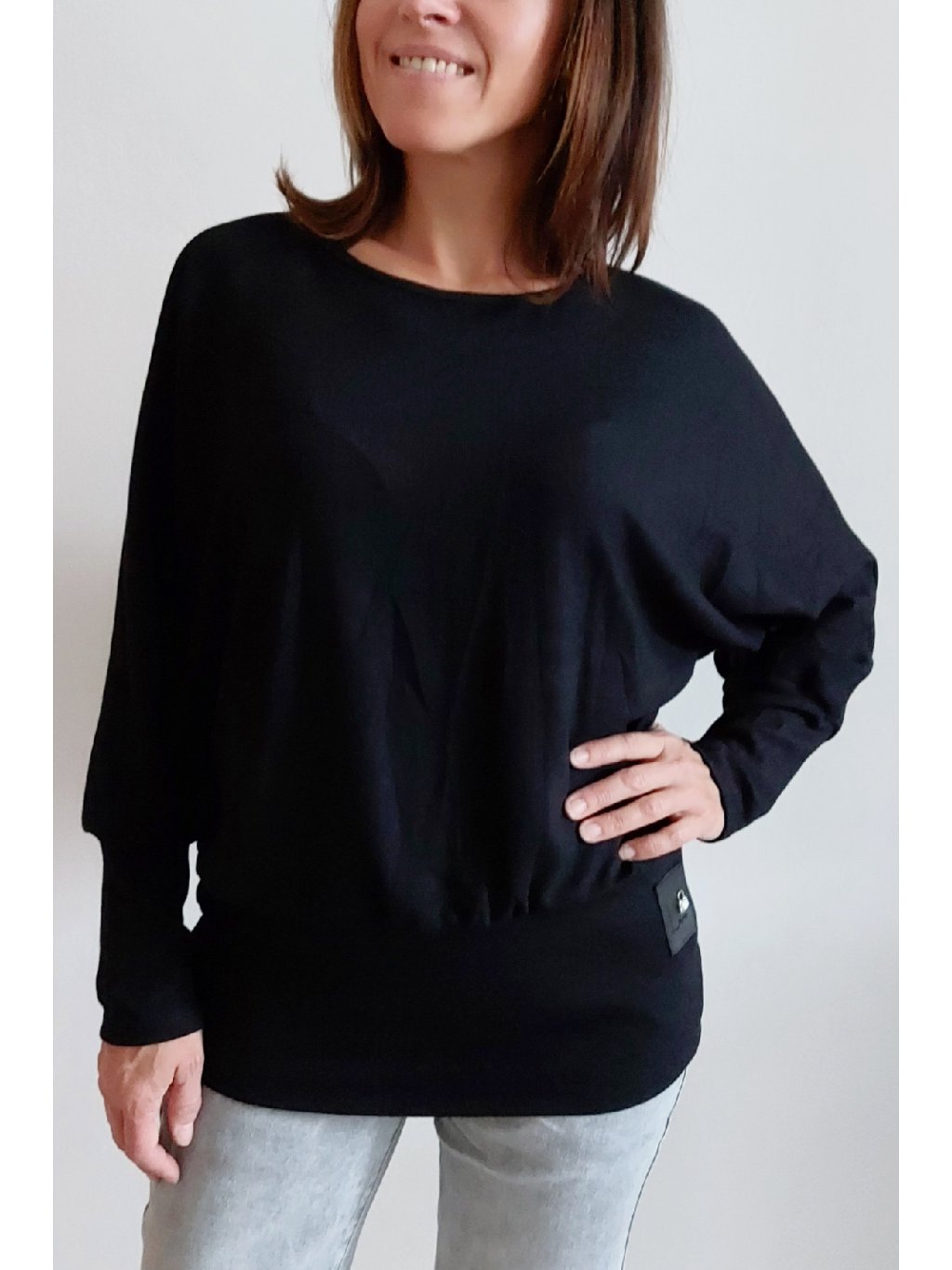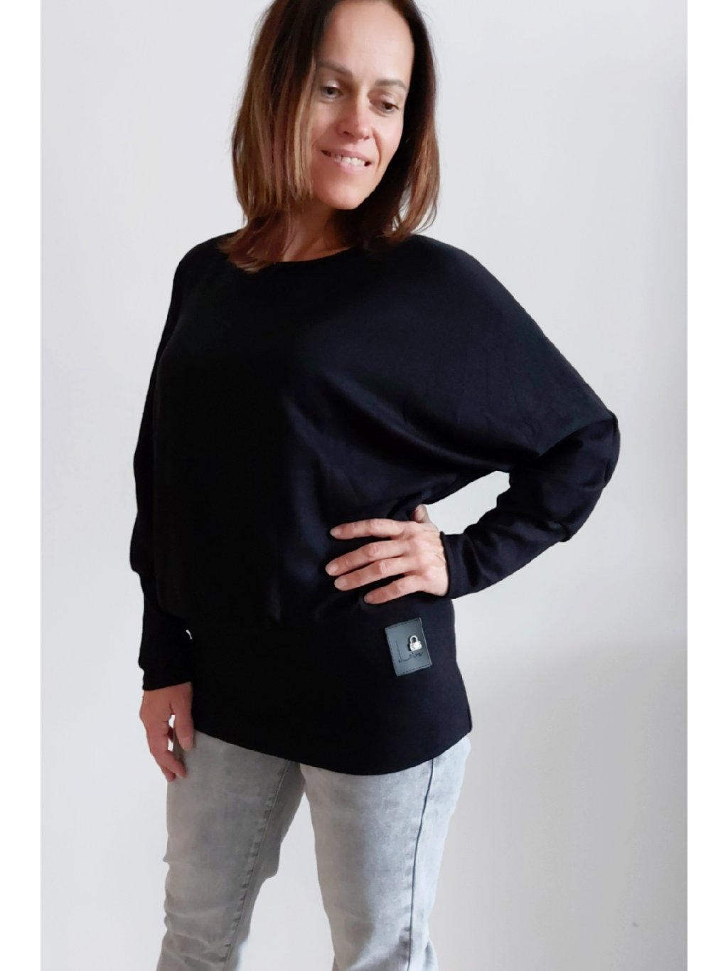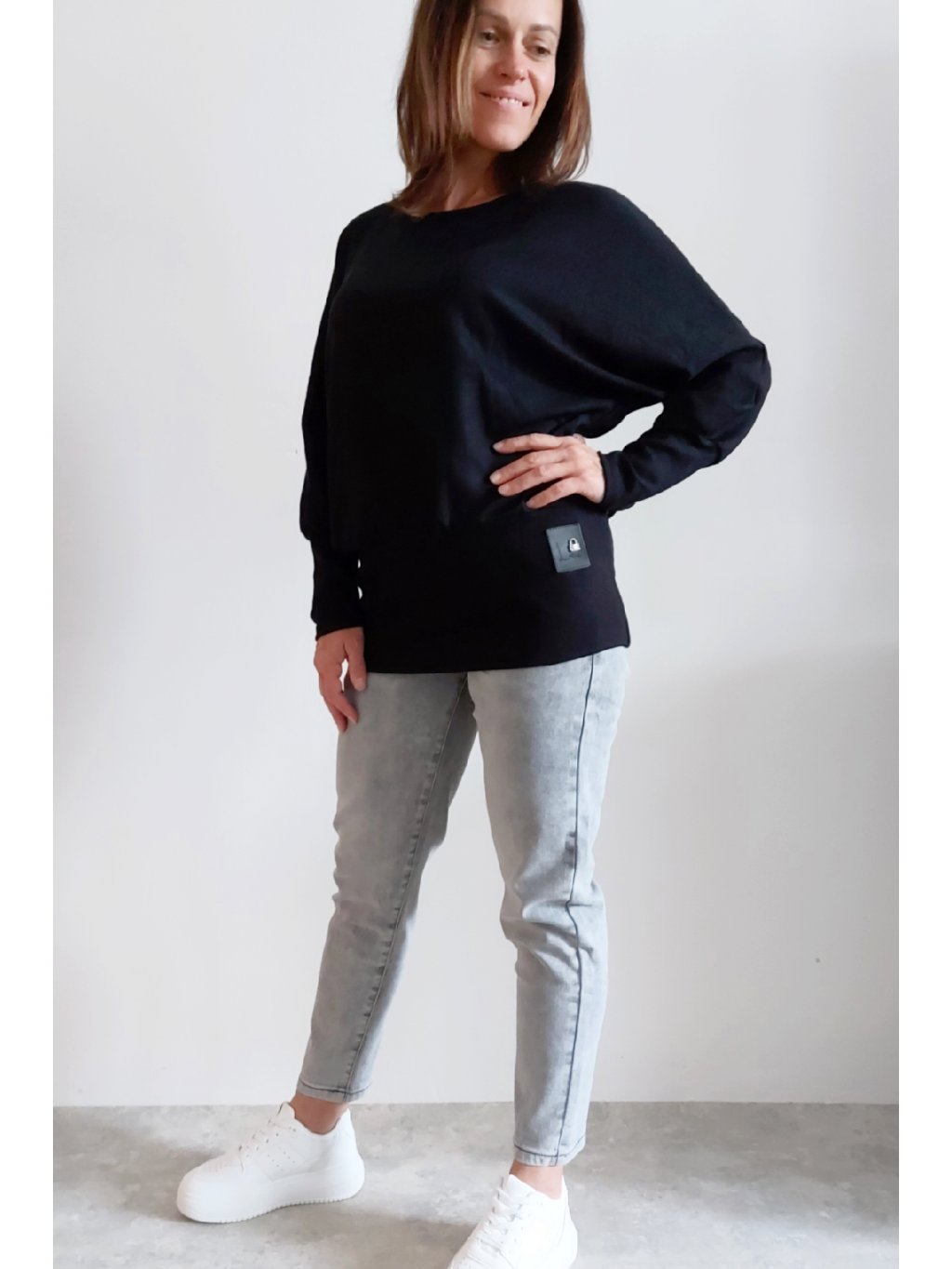 Lehčí svetrová tunika s širokým spodním lemem. Na jedné straně ozdobná nášivka. Rukávy dlouhé netopýřího střihu. Dokonale heboučký, příjemný materiál. Foceno na vel. XS, výška 156cm.