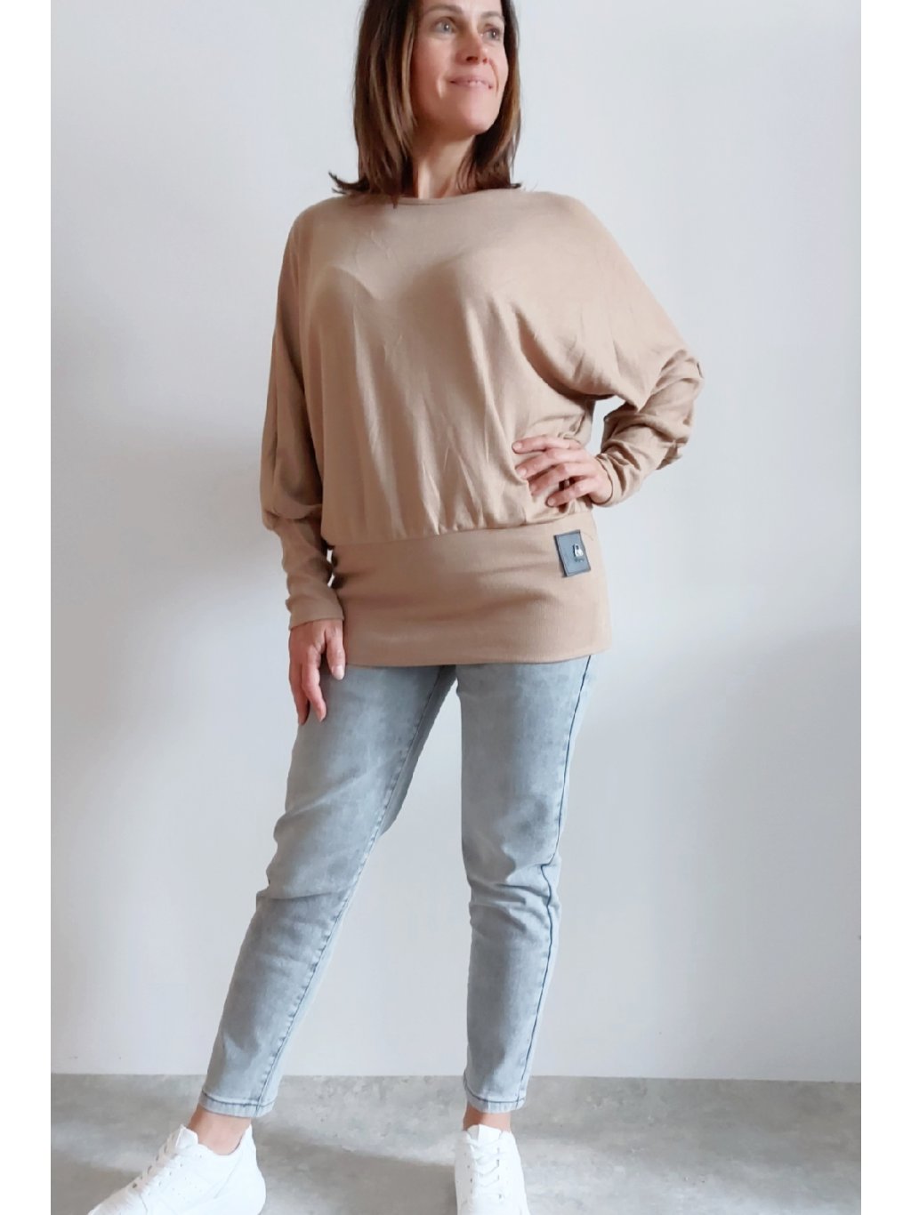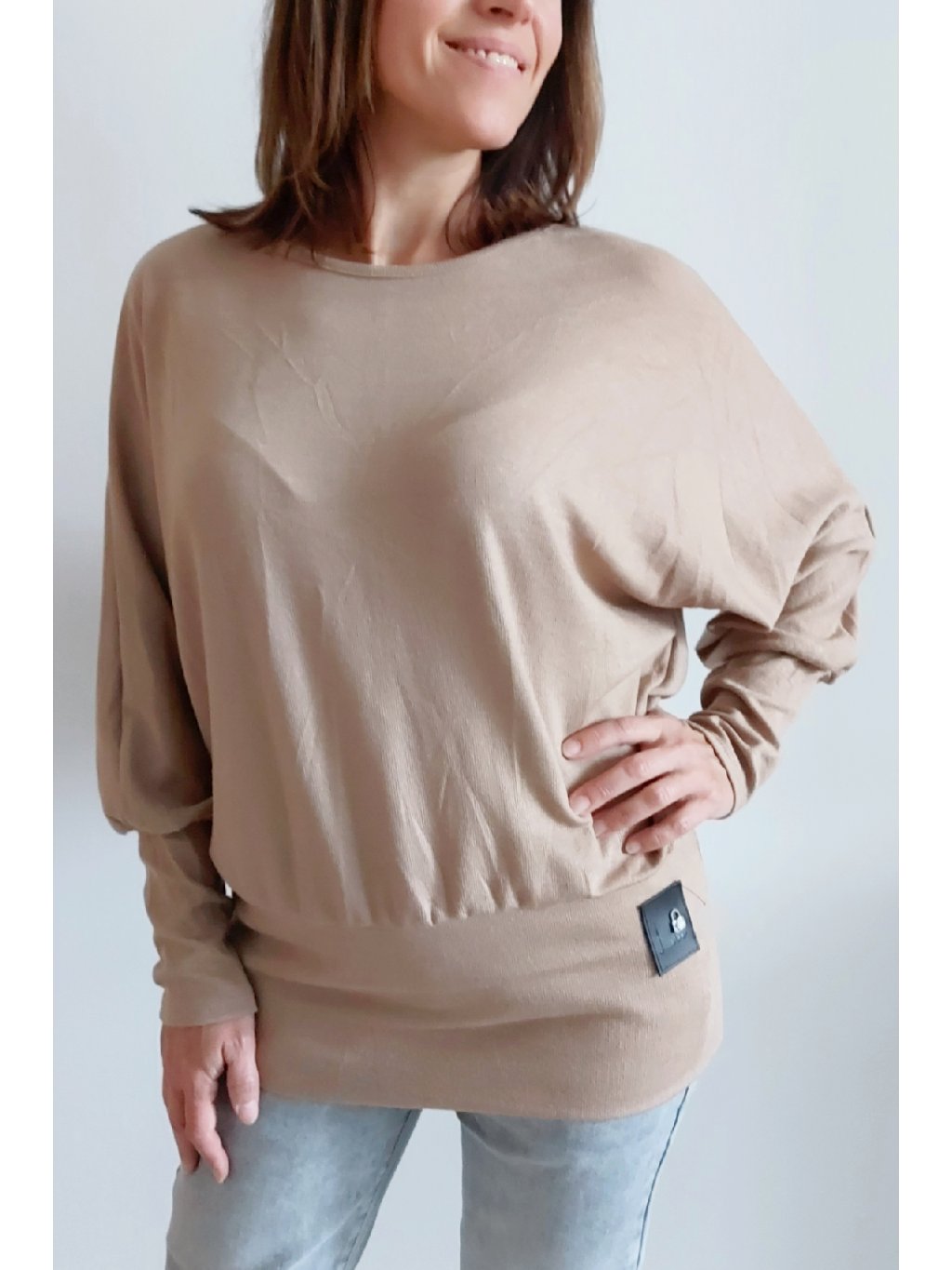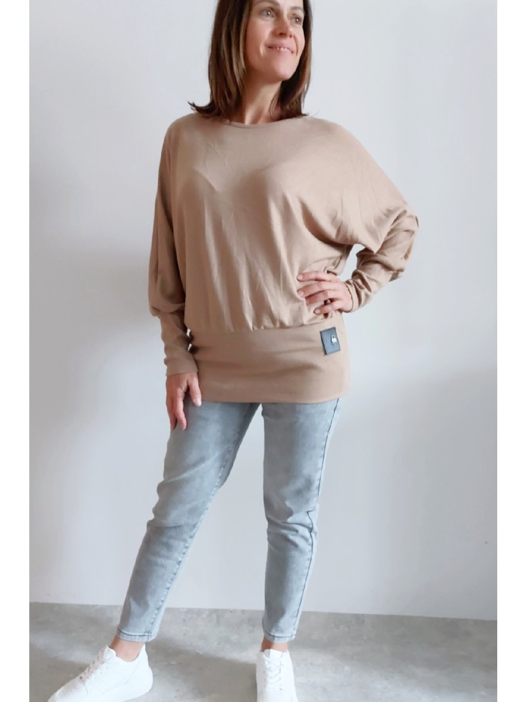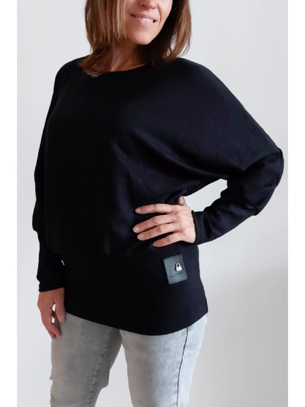 Lehčí svetrová tunika s širokým spodním lemem. Na jedné straně ozdobná nášivka. Rukávy dlouhé netopýřího střihu. Dokonale heboučký, příjemný materiál. Foceno na vel. XS, výška 156cm.