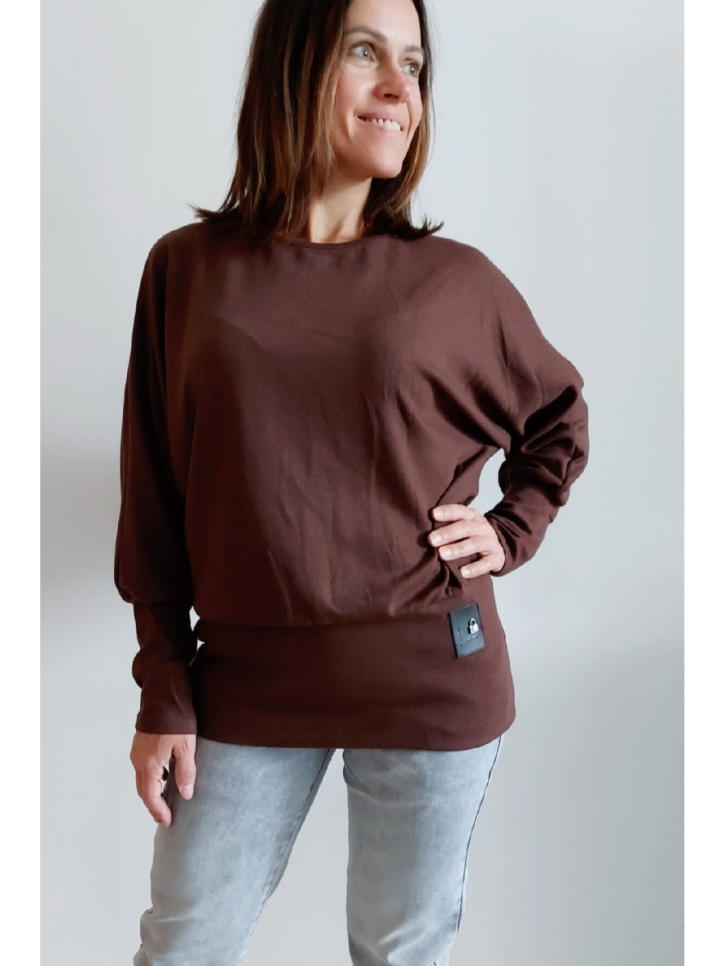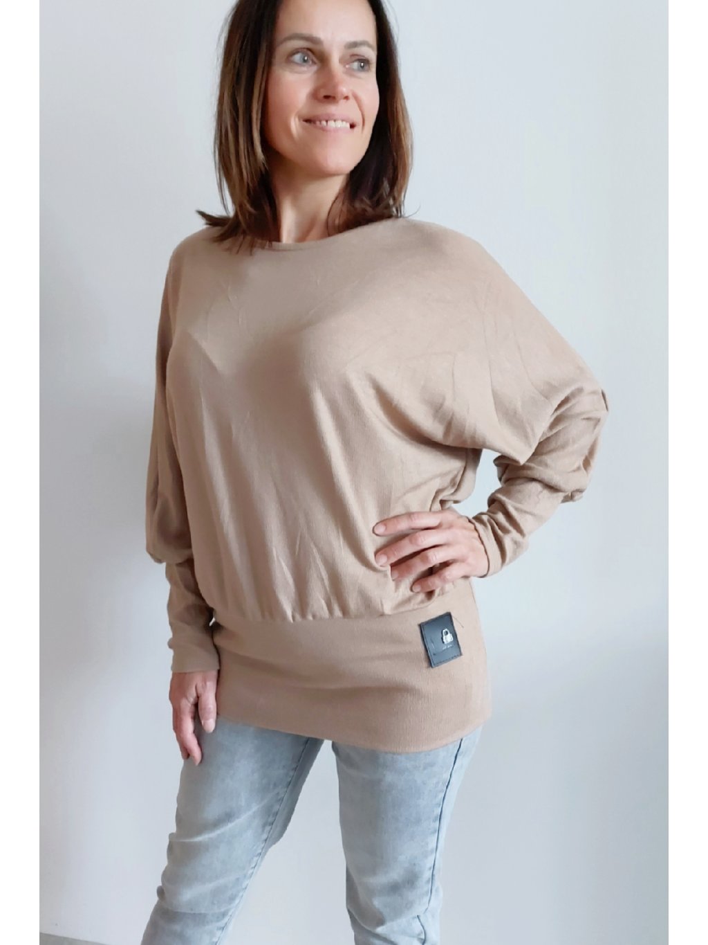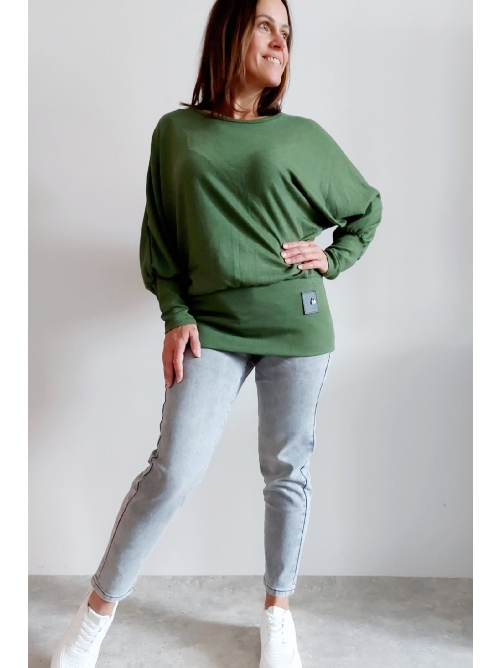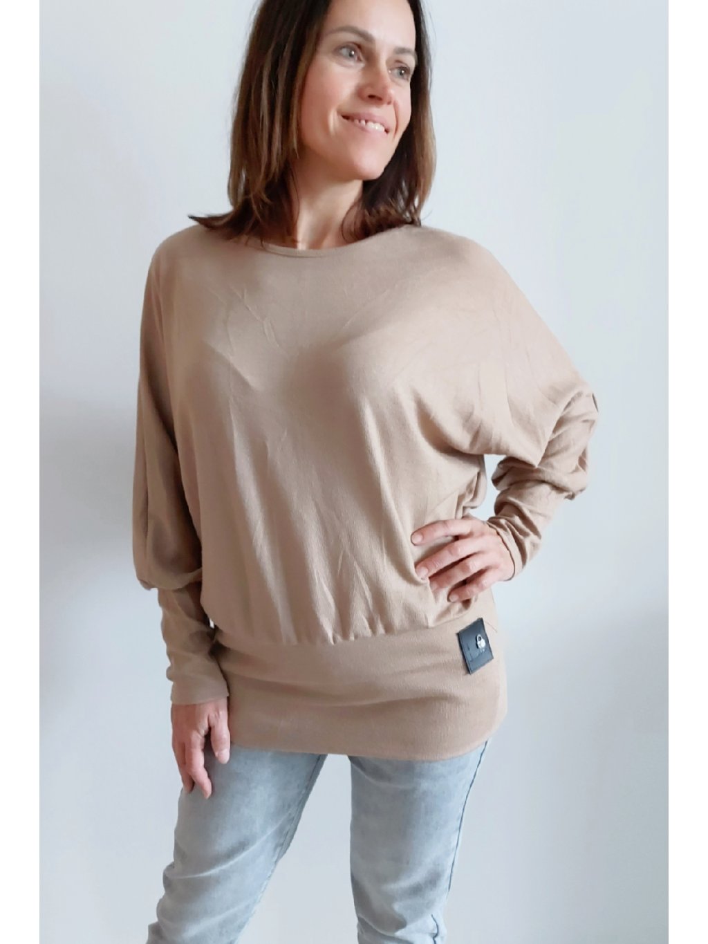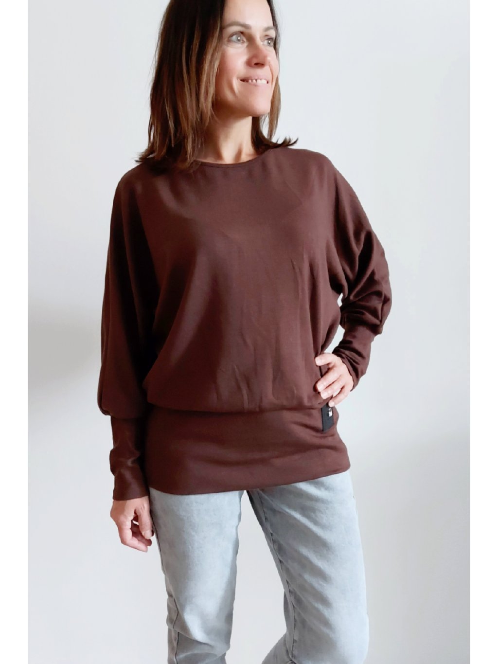 Lehčí svetrová tunika s širokým spodním lemem. Na jedné straně ozdobná nášivka. Rukávy dlouhé netopýřího střihu. Dokonale heboučký, příjemný materiál. Foceno na vel. XS, výška 156cm.