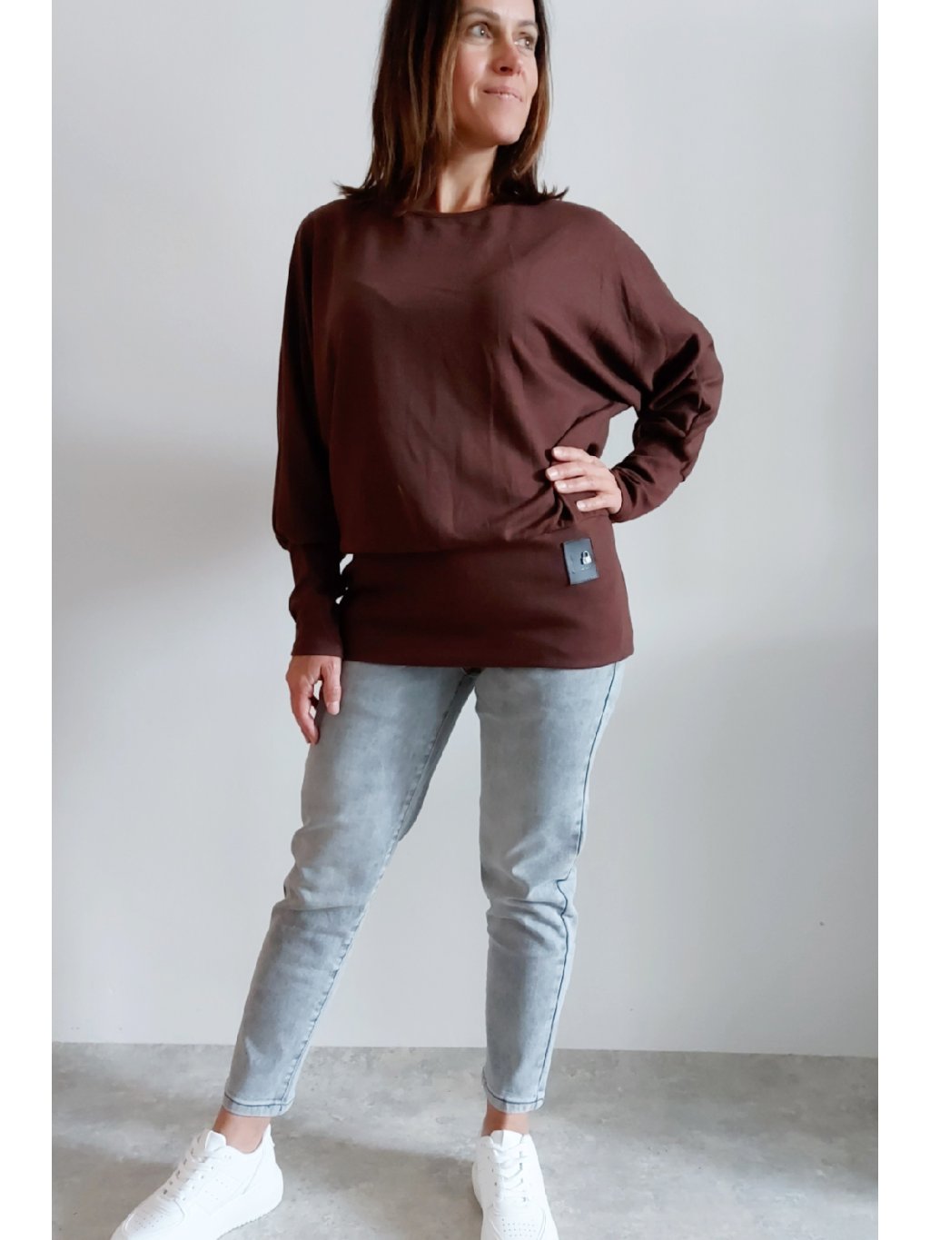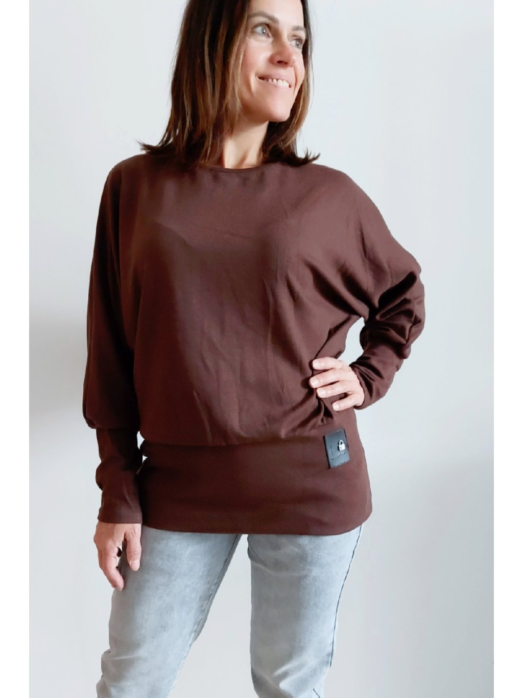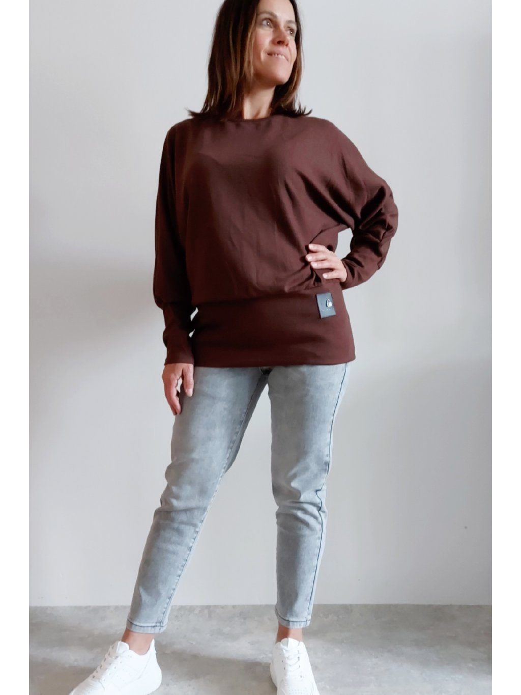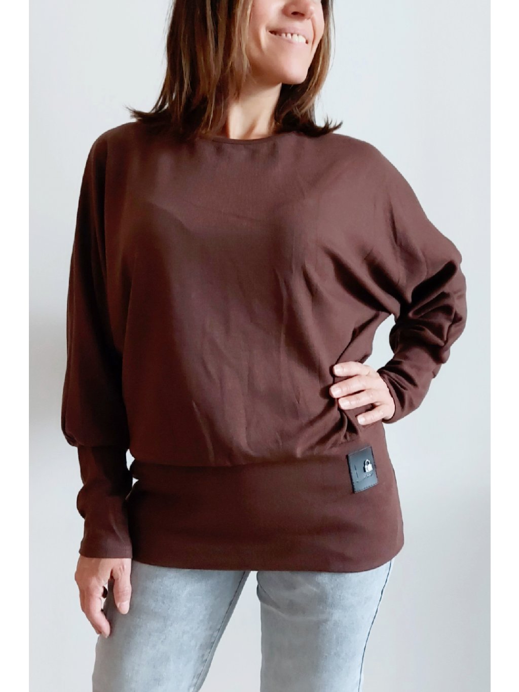 Lehčí svetrová tunika s širokým spodním lemem. Na jedné straně ozdobná nášivka. Rukávy dlouhé netopýřího střihu. Dokonale heboučký, příjemný materiál. Foceno na vel. XS, výška 156cm.