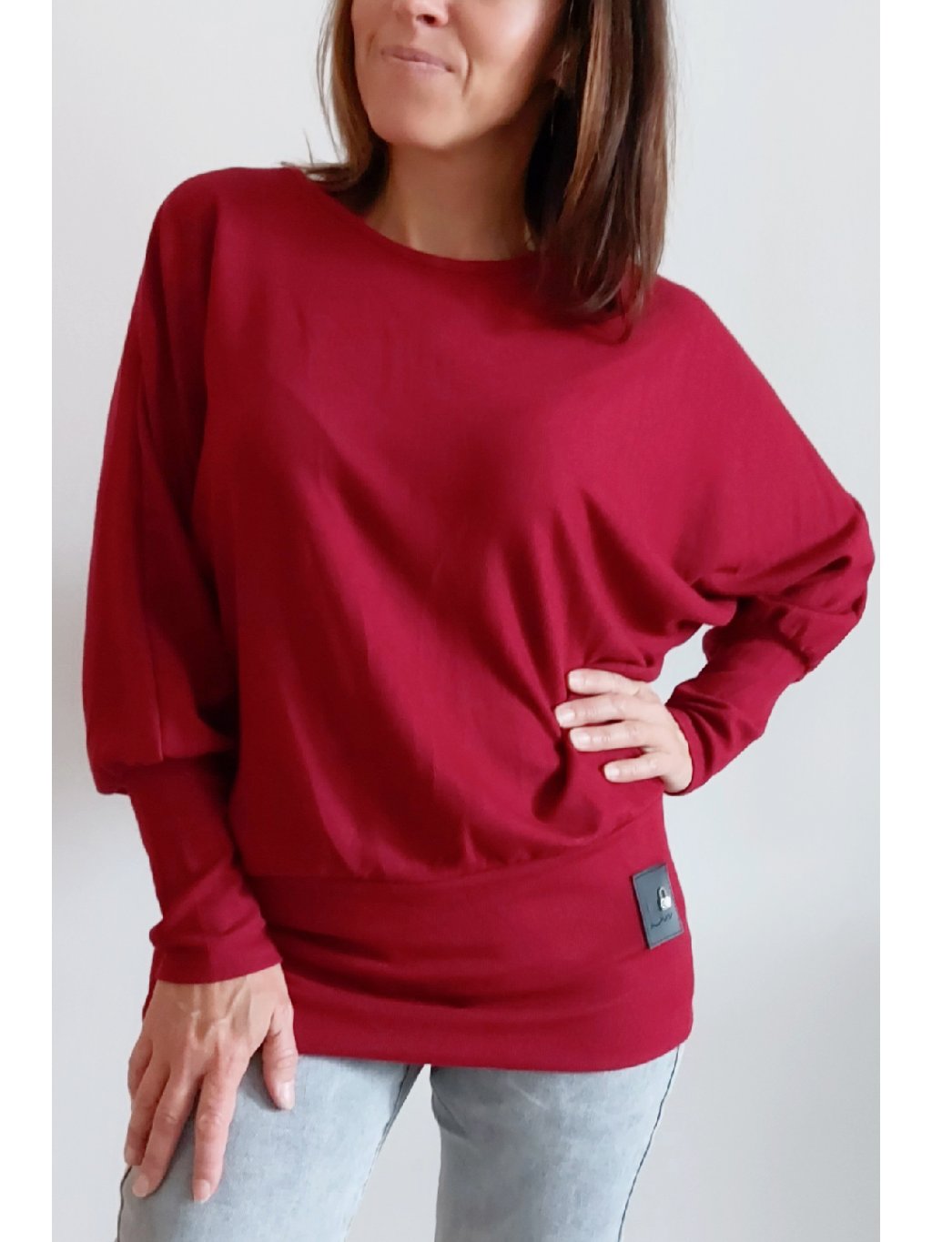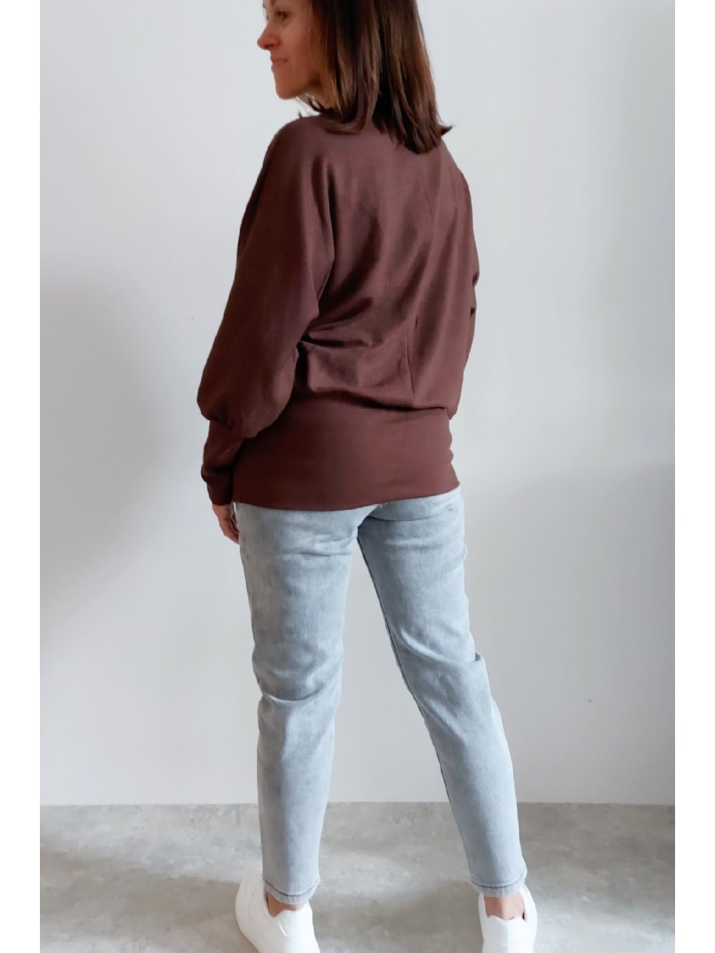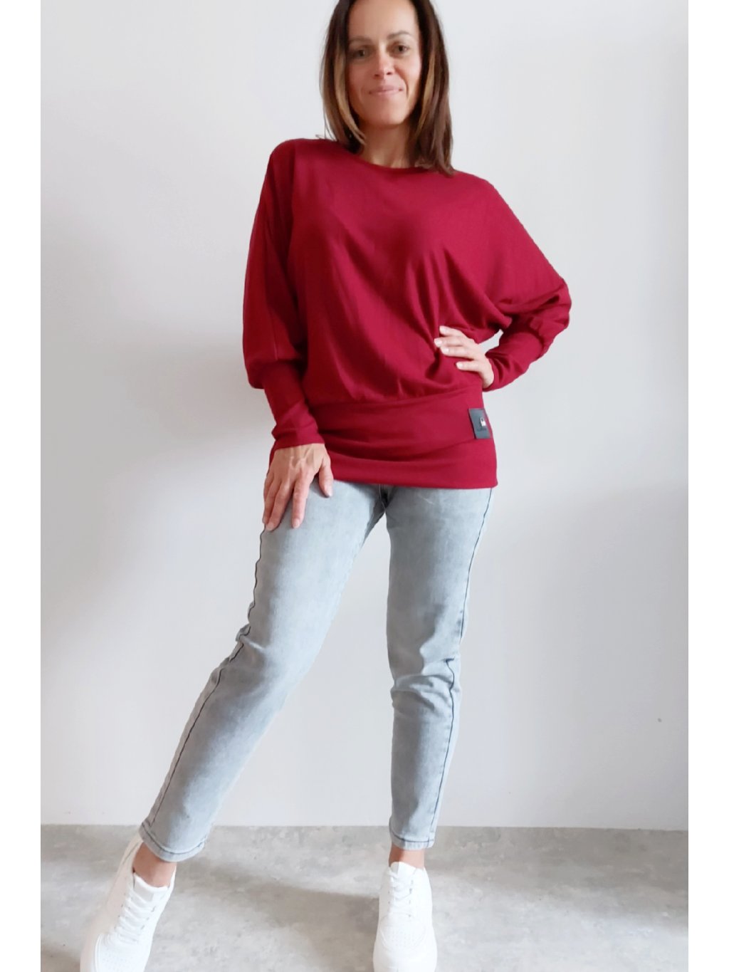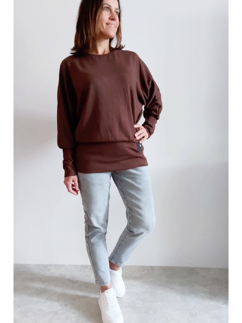 Lehčí svetrová tunika s širokým spodním lemem. Na jedné straně ozdobná nášivka. Rukávy dlouhé netopýřího střihu. Dokonale heboučký, příjemný materiál. Foceno na vel. XS, výška 156cm.